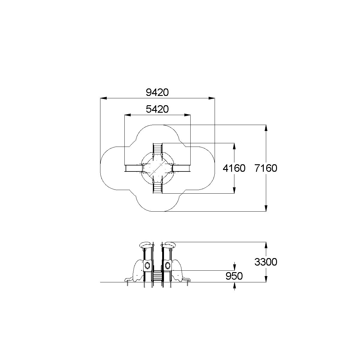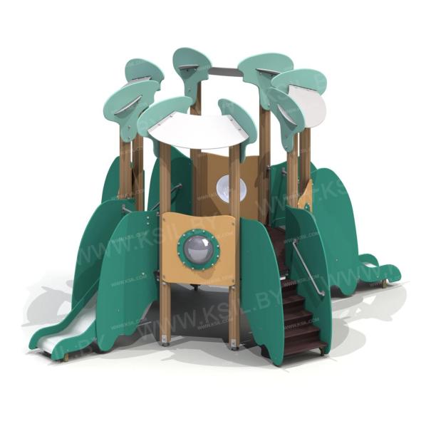 Детский игровой комплекс в морской тематике должен представлять собой модульную сборно-разборную конструкцию в морской тематике. Комплекс должен состоять из восьмигранной башни. К башне , с имитацией крыши типа, с высотой площадки не менее 950 мм должны быть пристроены: 2 горки, две лестницы, фанерные ограждения с иллюминатором. Несущие столбы комплекса должны быть выполнены из клееного деревянного бруса сечением не менее 100х100 мм и иметь скругленный профиль с канавкой посередине. Сверху открытый столб должен заканчиваться пластиковой заглушкой желтого цвета, снизу столб должен заканчиваться металлическим оцинкованным подпятником диаметром не менее 42 мм, который бетонируется в землю. Пол башни должен быть выполнен из влагостойкой фанеры толщиной не менее 21 мм. Горка должна состоять из ската, бортиков, защитной секции и защитной перекладины. Горка должна иметь стартовый участок высотой не менее 950 мм, участок скольжения и конечный участок. Скат должен быть изготовлен из единого листа нержавеющей стали толщиной 1,5 мм, утопленный в паз бортиков горки. Бортики горки должны быть высотой не менее 100 мм. Защитная перекладина должна быть выполнена из металлической трубы диаметром не менее 33 мм, побуждающая ребенка присесть и установлена на высоте не менее 600 мм от уровня поверхности стартового участка горки. Защитная секция горки должна быть выполнена из влагостойкой фанеры толщиной не менее 21 мм. Лестница высотой не менее 950 мм должна быть оснащена перилами, выполненные из влагостойкой фанеры толщиной 21 мм с поручнем. Ступени лестниц должны быть выполнены из ламинированной противоскользящей влагостойкой фанеры толщиной не менее 21 мм. Расстояние между ступенями должно быть одинаковым. Перекладины, поручни должны быть выполнены из металлической трубы диаметром не менее 33 мм. Имитация крыши должна состоять из 4-х скатов выполненных из влагостойкой фанеры толщиной не менее 15 мм и 8-ми фигурных фронтонов из влагостойкой фанеры толщиной не менее 21 мм.