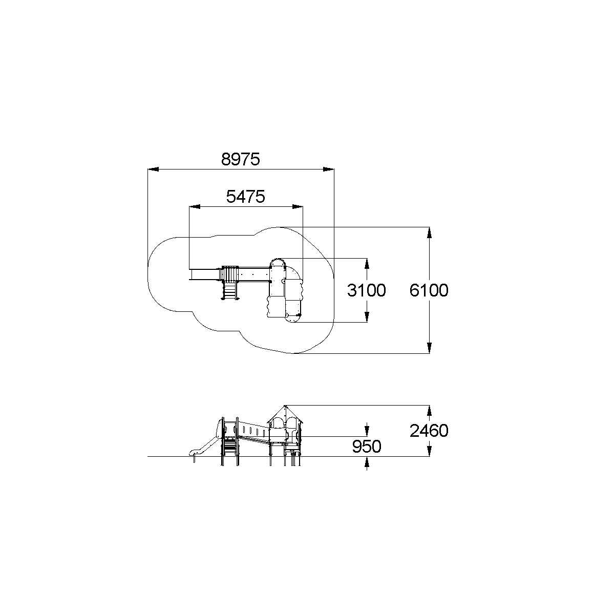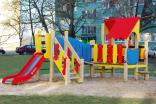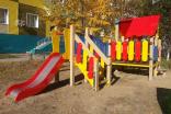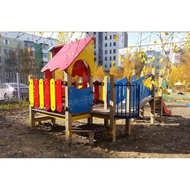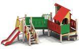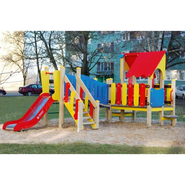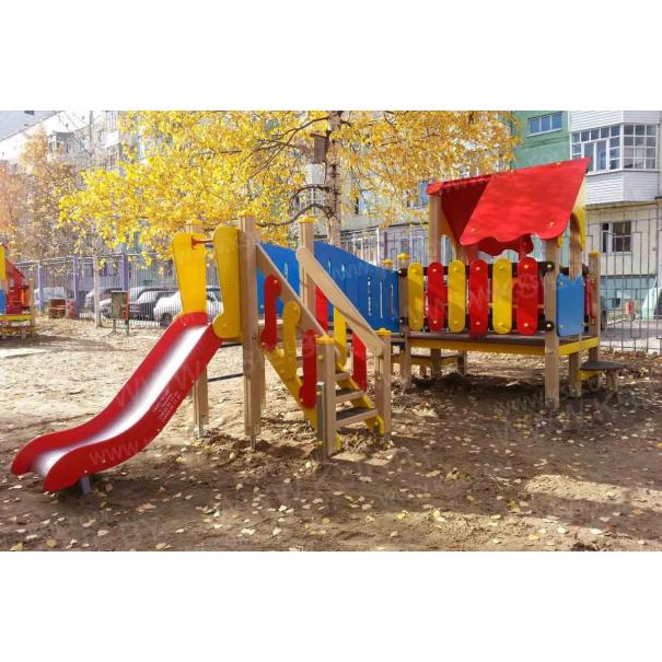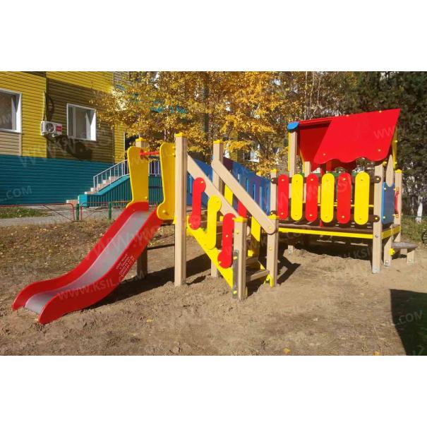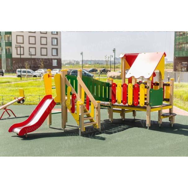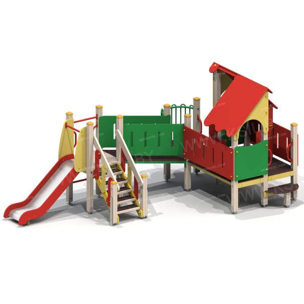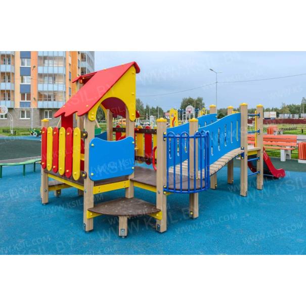 Детский игровой комплекс должен представлять собой модульную сборно-разборную конструкцию, состоящую из одной башни с крышей с двумя радиусными площадками, полубашни с балконом и одной башни без крыши. Полубшаня и башня без крыши должны быть соединены между собой наклонным мостом. К башне с крышей, с высотой площадки не менее 650 мм должны быть пристроены: фанерные ограждения, перегородки, поручни. Радиусные площадки должны быть установлены в образовавшемся внешнем углу между башней и полубашней, а также перед входом на площадку башни. К полубашне с высотой площадки не менее 650 мм должны быть пристроены: радиусный балкон, поручни. К башне без крыши с высотой площадки не менее 950 мм должны быть пристроены: горка, лестница, ограждение в виде перекладин, вертикальная лестница, поручни. Несущие столбы комплекса должны быть выполнены из клееного деревянного бруса сечением не менее 100х100 мм и иметь скругленный профиль с канавкой посередине. Сверху столб должен заканчиваться пластиковой заглушкой, снизу столб должен заканчиваться металлическим оцинкованным подпятником диаметром не менее 42 мм, который бетонируется в землю. Пол башни без крыши должен быть выполнен из ламинированной противоскользящей водостойкой фанеры толщиной не менее 21 мм. Пол башни с крышей, полубашни и радиусных площадок должен быть выполнен из водостойкой противоскользящей фанеры толщиной не менее 21 мм. Крыша башни должна быть двускатной, не сплошной, частично закрывающая площадь пола, визуально деля его на две части. Скаты и фронтоны крыши должны быть изготовлены из водостойкой фанеры толщиной не менее 21 мм. Горка должна состоять из ската, бортиков, защитной секции и защитной перекладины. Горка должна иметь стартовый участок высотой не менее 950 мм, участок скольжения и конечный участок. Скат должен быть изготовлен из единого листа нержавеющей стали толщиной 1,5 мм, утопленный в паз бортиков горки. Бортики горки, выполненные из водостойкой фанеры толщиной не менее 21 мм должны быть высотой не менее 100 мм. Защитная перекладина должна быть выполнена из металлической трубы диаметром не менее 33 мм, побуждающая ребенка присесть и установлена на высоте не менее 600 мм от уровня поверхности стартового участка горки. Защитная секция горки должна быть выполнена из водостойкой фанеры толщиной не менее 21 мм. Лестница высотой не менее 950 мм должна быть оснащена перилами, выполненными из водостойкой фанеры толщиной не менее 21 мм. Перила должны быть установлены от первой ступени. Ступени лестниц должны быть выполнены из ламинированной противоскользящей водостойкой фанеры толщиной не менее 21 мм. Расстояние между ступенями должно быть одинаковым. Радиусный балкон должен состоять из пола, выполненного из водостойкой ламинированной противоскользящей фанеры толщиной не менее 21 мм и радиусного металлического ограждения из труб диаметрами не менее 21 мм и не менее 33 мм. Ограждение башни, перегородки, должны быть выполнены из водостойкой фанеры толщиной не менее 21. Ограждение в виде перекладин, вертикальная лестница, поручни должны быть выполнены из металлической трубы диаметром не менее 33 мм. Наклонный мост должен состоять из металлического каркаса, настила и перил. Настил должен быть выполнен из ламинированной водостойкой фанеры толщиной не менее 21 мм. Перилами моста являю