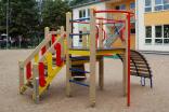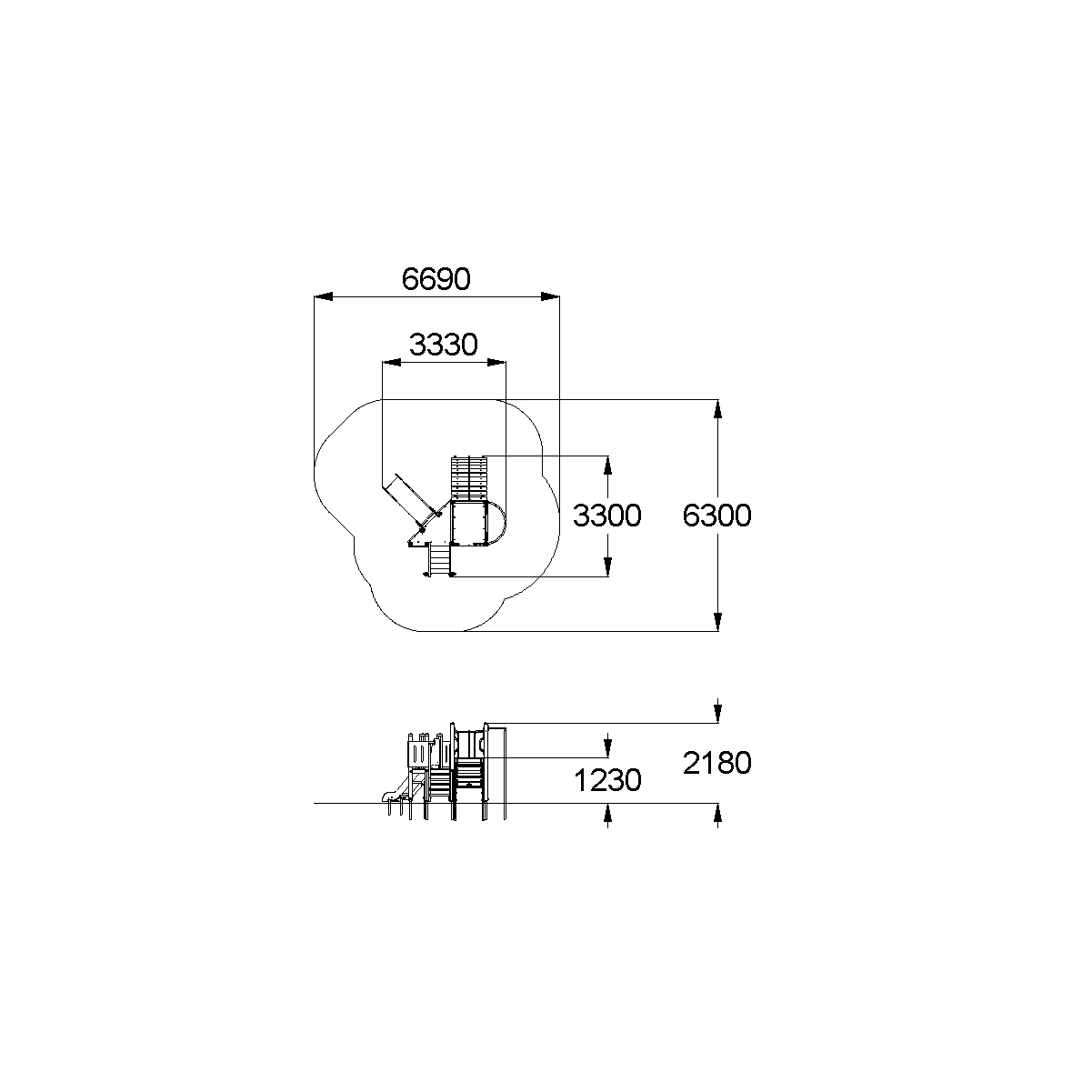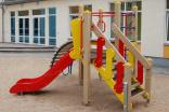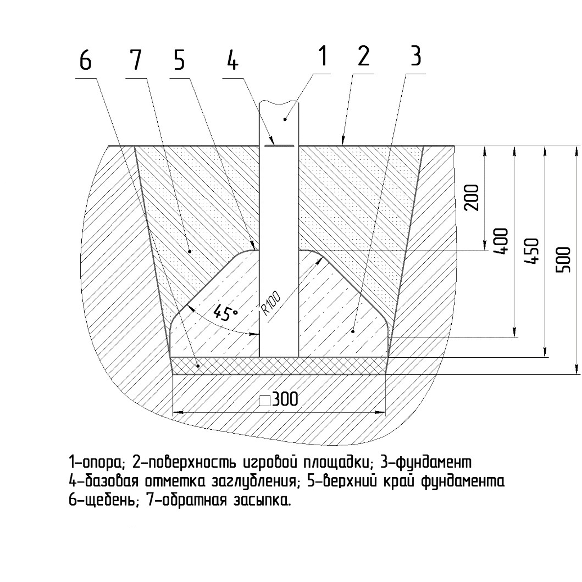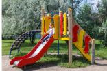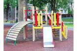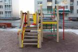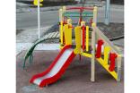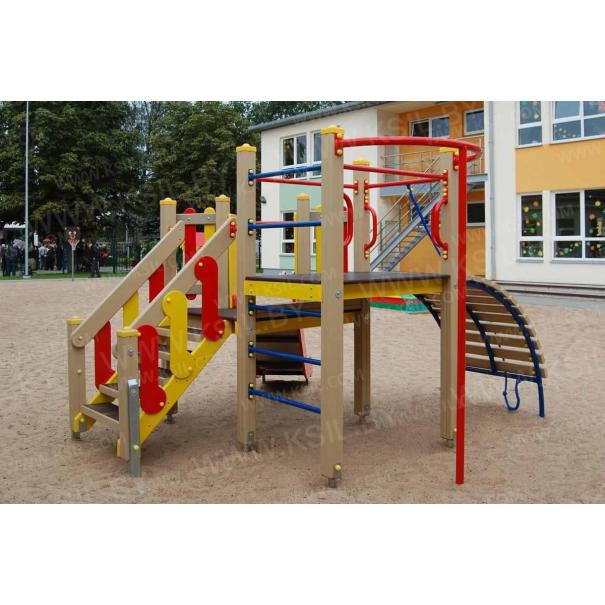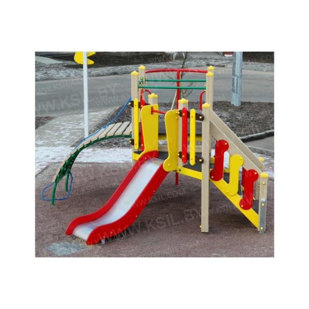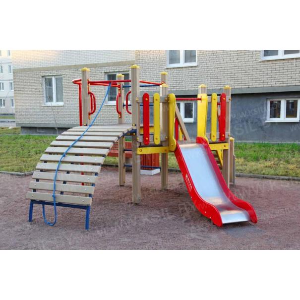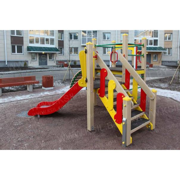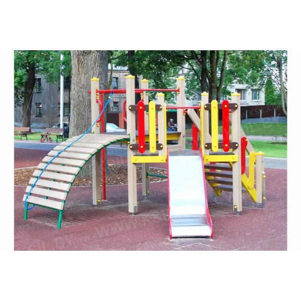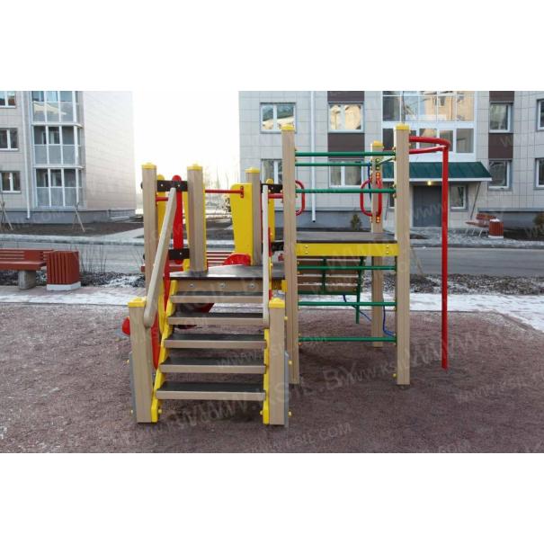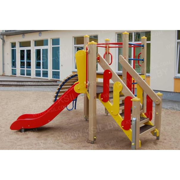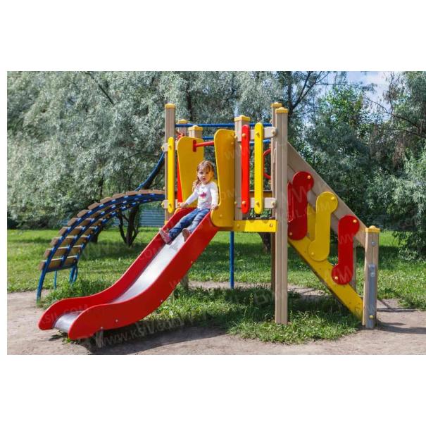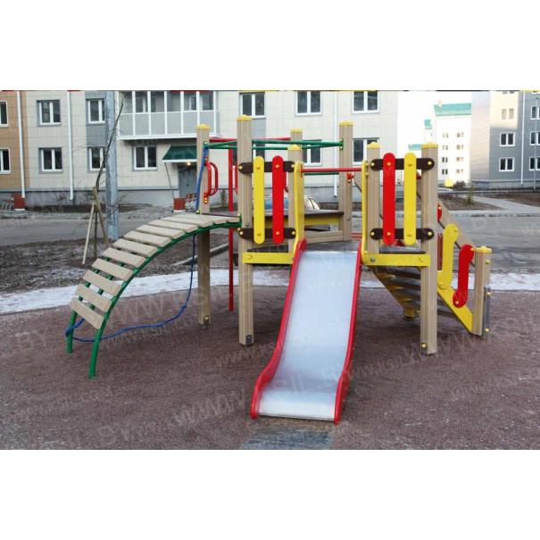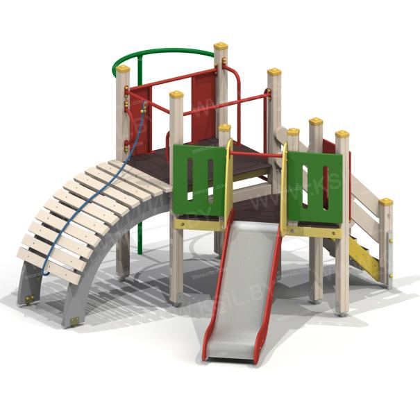 Детский игровой комплекс должен состоять из башни с полубашней треугольной формы. К башне, с высотой площадки не менее 1230 мм, должны быть пристроены:трап-барабан фанерный с перекладиной и канатом, вертикальный шест без спирали с креплением в виде дуги, металлическое ограждение в виде перекладин, вертикальная лестница и поручни. К полубашне треугольной формы с высотой площадки не менее 930 мм, должны быть пристроены: лестница, горка, фанерное ограждение с отверстиями. Несущие столбы комплекса должны быть выполнены из клееного деревянного бруса сечением не менее 100х100 мм и иметь скругленный профиль с канавкой посередине. Сверху столб должен заканчиваться пластиковой заглушкой, снизу столб должен заканчиваться металлическим оцинкованным подпятником диаметром не менее 42 мм, который бетонируется в землю. Для увеличения жесткости конструкций в опорных столбах должны быть сделаны специальные запилы, в которые закрепляются прогоны полов, изнутри зафиксированные специальными оцинкованными уголками. Полы башни и полубашни должны быть изготовлены из водостойкой ламинированной нескользящей фанеры толщиной не менее 21 мм. Ограждение полубашни должно быть выполнено из водостойкой окрашенной фанеры толщиной не менее 21 мм. Лестница высотой не менее 930 мм должна быть оснащена перилами, выполненными из деревянной доски толщиной не менее 40 мм. Перила должны быть установлены от первой ступени. Ступени лестниц должны быть выполнены из ламинированной противоскользящей водостойкой фанеры толщиной не менее 21 мм. Расстояние между ступенями должно быть одинаковым. Горка должна состоять из ската, бортиков, защитной секции и защитной перекладины. Горка должна иметь стартовый участок высотой не менее 930 мм, участок скольжения и конечный участок. Скат должен быть изготовлен из единого листа нержавеющей стали толщиной 1,5 мм, утопленный в паз бортиков горки. Бортики горки, выполненные из водостойкой фанеры толщиной не менее 21 мм должны быть высотой не менее 100 мм. Защитная перекладина должна быть выполнена из металлической трубы диаметром не менее 33 мм, побуждающая ребенка присесть и установлена на высоте не менее 600 мм от уровня поверхности стартового участка горки. Защитная секция горки должна быть выполнена из водостойкой фанеры толщиной не менее 21 мм. Трап- барабан фанерный должен состоять из направляющих опор, выполненных из сдвоенных фанерных частей, толщина фанеры не менее 21 мм, и наборных частей, равномерно распределенных по опорам и выполненных из деревянной доски толщиной 40 мм. Снизу трап-барабан опирается на окрашенный подпятник из металлической трубы диаметром не менее 33,5 мм, который бетонируется в землю. Фанерный трап-барабан должен быть оснащен перекладиной, выполненной из металлической трубы диаметром не менее 33 мм с полиамидным или полипропиленовым канатом диаметром не менее 16 мм. Вертикальный шест без спирали должен быть выполнены из металлической трубы диаметром не менее 42 мм. Нижняя часть шеста бетонируется в землю. Перекладины вертикальной лестницы, ограждение в виде перекладин, поручни должны быть выполнены из металлической трубы диаметром не менее 33 мм.