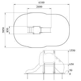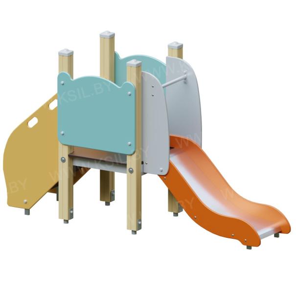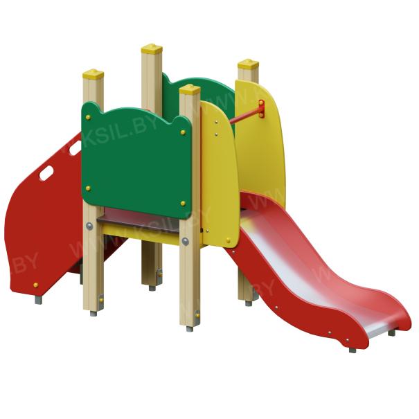 Детский игровой комплекс должен представлять собой модульную сборно-разборную конструкцию, состоящую из площадки с горкой, лестницей и ограждениями. Несущие столбы комплекса должны быть выполнены из клееного деревянного бруса сечением не менее 100х100 мм и иметь скругленный профиль с канавкой посередине. Сверху столб должен заканчиваться пластиковой заглушкой, снизу столб должен заканчиваться металлическим оцинкованным подпятником диаметром не менее 42 мм, который бетонируется в землю. Пол площадки должен быть выполнен из водостойкой ламинированной нескользящей фанеры толщиной не менее 21 мм. Горка должна иметь стартовый участок высотой не менее 650 мм, участок скольжения и конечный участок. Скат должен быть изготовлен из единого листа нержавеющей стали толщиной 1,5 мм, утопленный в паз бортиков горки. Бортики горки должны быть высотой не менее 100 мм. Защитная перекладина должна быть выполнена из металлической трубы диаметром не менее 33 мм, побуждающая ребенка присесть и установлена на высоте не менее 600 мм от уровня поверхности стартового участка горки. Защитная секция горки должна быть выполнена из водостойкой фанеры толщиной не менее 21 мм. Лестница высотой не менее 650 мм должна быть оснащена перилами, выполненными из водостойкой фанеры толщиной не менее 21 мм. Перила должны быть установлены от первой ступени. Ступени лестниц должны быть выполнены из ламинированной противоскользящей водостойкой фанеры толщиной не менее 21 мм. Расстояние между ступенями должно быть одинаковым. Ограждение должно быть выполнено из водостойкой фанеры толщиной не менее 21 мм.