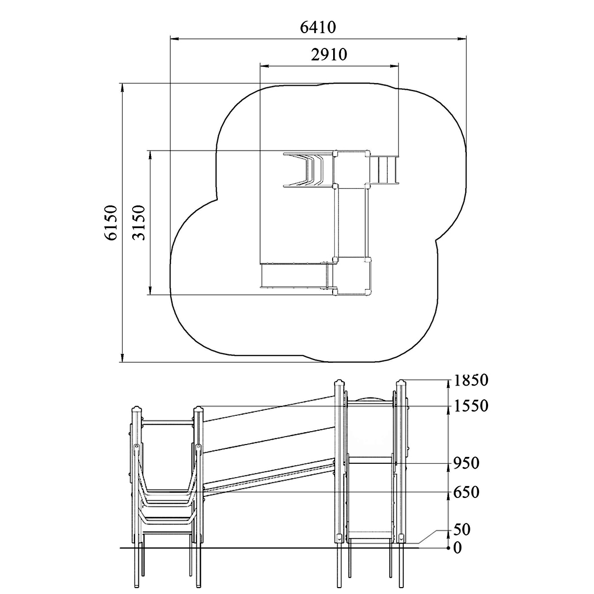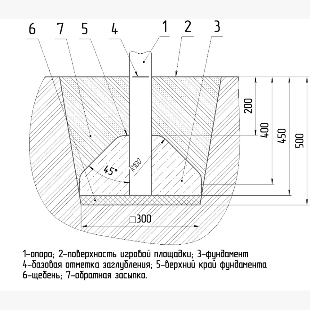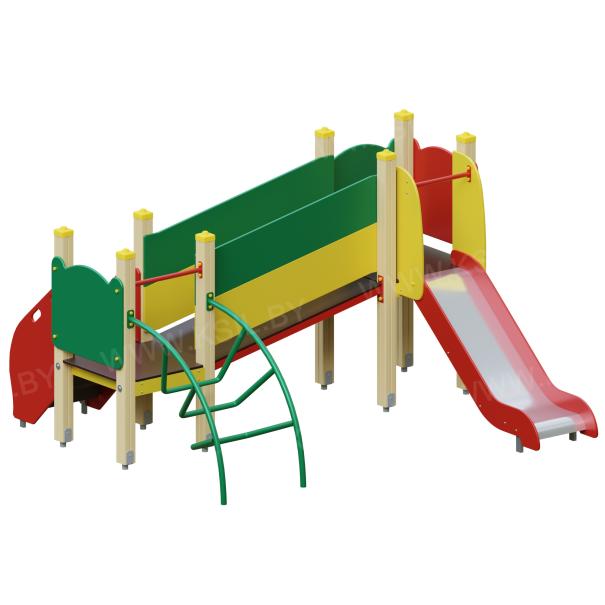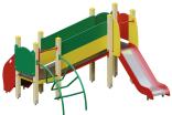 Детский игровой комплекс должен представлять собой модульную сборно-разборную конструкцию, состоящую из 2-х башен, соединенных между собой наклонным мостом. К башне 1, с высотой площадки не менее 950 мм должны быть пристроены: горка и фанерные ограждения . К башне 2 с высотой площадки не менее 650 мм должны быть пристроены: фанерное ограждение, лестница, лиана, перекладина. Несущие столбы комплекса должны быть выполнены из клееного деревянного бруса сечением не менее 100х100 мм и иметь скругленный профиль с канавкой посередине. Сверху столб должен заканчиваться пластиковой заглушкой, снизу столб должен заканчиваться металлическим оцинкованным подпятником диаметром не менее 42 мм, который бетонируется в землю. Пол должен быть выполнен из ламинированной противоскользящей водостойкой фанеры толщиной не менее 21 мм. Горка должна состоять из ската, бортиков, защитной секции и защитной перекладины. Горка должна иметь стартовый участок высотой не менее 950 мм, участок скольжения и конечный участок. Скат должен быть изготовлен из единого листа нержавеющей стали толщиной 1,5 мм, утопленный в паз бортиков горки. Бортики горки, выполненные из водостойкой фанеры толщиной не менее 21 мм должны быть высотой не менее 100 мм. Защитная перекладина должна быть выполнена из металлической трубы диаметром не менее 33 мм, побуждающая ребенка присесть и установлена на высоте не менее 600 мм от уровня поверхности стартового участка горки. Защитная секция горки должна быть выполнена из водостойкой фанеры толщиной не менее 21 мм. Лестница высотой не менее 650 мм должна быть оснащена перилами, выполненными из водостойкой фанеры толщиной не менее 21 мм. Перила должны быть установлены от первой ступени. Ступени лестниц должны быть выполнены из ламинированной противоскользящей водостойкой фанеры толщиной не менее 21 мм. Расстояние между ступенями должно быть одинаковым. Ограждения башен должны быть выполнены из водостойкой фанеры толщиной не менее 21 мм. Перекладина должна быть выполнена из металлической трубы диаметром не менее 33 мм. Наклонный мост должен состоять металлического каркаса, настила и ограждения. Настил должен быть выполнен из ламинированной водостойкой фанеры толщиной не менее 21 мм. Ограждение моста должны быть выполнены из водостойкой фанеры толщиной не менее 21 мм. Металлический каркас моста должен быть разборным и состоять из металлической профильной трубы сечением не менее 50х25 мм. Лиана должна состоять их 2-х наклонных дуг выполненных из металлической трубы диаметром не менее 42 мм и П- образных ступенек из трубы диаметром не менее 33 мм.
