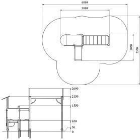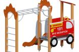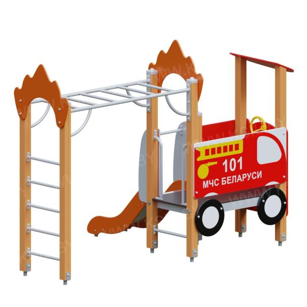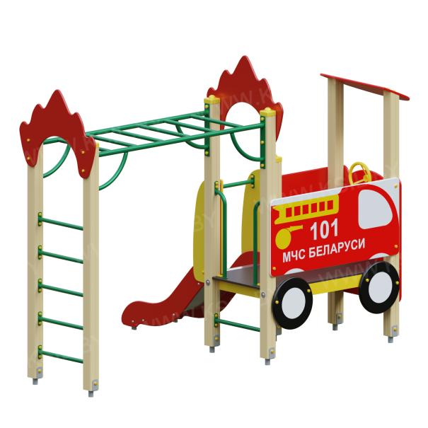 Детский игровой комплекс должен представлять собой модульную сборно-разборную конструкцию, состоящую из башни, имитирующую пожарную машину с вынесенным гимнастическим комплексом. К башне , с высотой площадки не менее 650 мм должны быть пристроены: горка, фанерное ограждение, стилизованное под пожарную машину, декоративные элементы в виде колес, руль, козырек, металлический поручень. Вынесенный гимнастический комплекс должен состоять из рукохода и шведской стенки. Несущие столбы комплекса должны быть выполнены из клееного деревянного бруса сечением не менее 100х100 мм и иметь скругленный профиль с канавкой посередине. Сверху столб должен заканчиваться пластиковой заглушкой, снизу столб должен заканчиваться металлическим оцинкованным подпятником диаметром не менее 42 мм, который бетонируется в землю. Пол башни должен быть выполнен из ламинированной противоскользящей водостойкой фанеры не менее 21 мм. Горка должна состоять из ската, бортиков, защитной секции и защитной перекладины. Горка должна иметь стартовый участок высотой не менее 650 мм, участок скольжения и конечный участок. Скат должен быть изготовлен из единого листа нержавеющей стали толщиной 1,5 мм, утопленный в паз бортиков горки. Бортики горки должны быть высотой не менее 100 мм. Защитная перекладина должна быть выполнена из металлической трубы диаметром не менее 33 мм, побуждающая ребенка присесть и установлена на высоте не менее 600 мм от уровня поверхности стартового участка горки. Защитная секция горки должна быть выполнена из водостойкой фанеры толщиной не менее 21 мм. Фанерное ограждение должно быть выполнено из водостойкой фанеры толщиной не менее 21 мм. Козырек и декоративные элементы должны быть выполнены из водостойкой фанеры толщиной не менее 15 мм. Шведская стенка, рукоход, перекладины детского комплекса должны быть выполнены из металлической трубы диаметром не менее 33 мм.