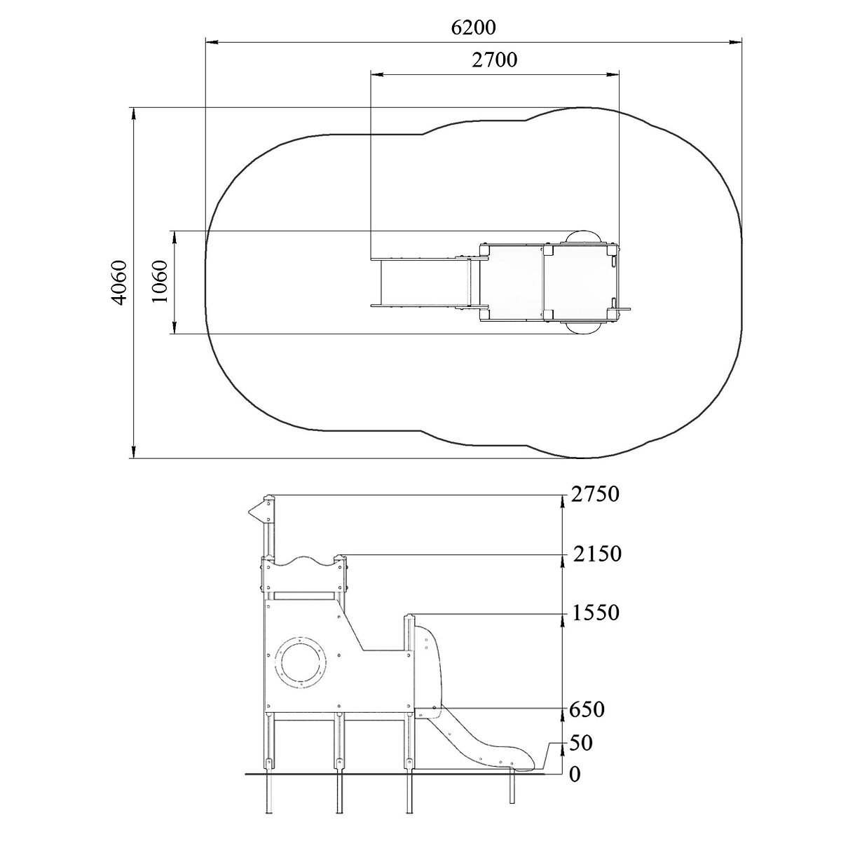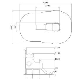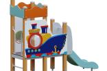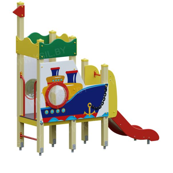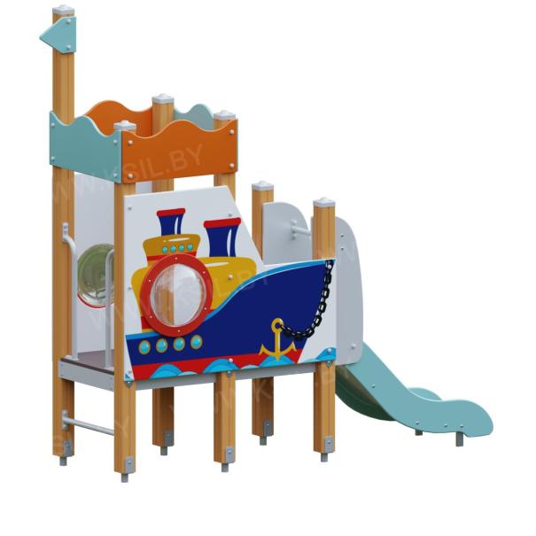 Детский игровой комплекс должен представлять собой модульную сборно-разборную конструкцию стилизованную под корабль, состоящую из площадки с горкой, имитацией крыши и ограждениями. Несущие столбы комплекса должны быть выполнены из клееного деревянного бруса сечением не менее 100х100 мм и иметь скругленный профиль с канавкой посередине. Сверху столб должен заканчиваться пластиковой заглушкой, снизу столб должен заканчиваться металлическим оцинкованным подпятником диаметром не менее 42 мм, который бетонируется в землю. Пол площадки должен быть выполнен из водостойкой ламинированной нескользящей фанеры толщиной не менее 21 мм. Горка должна иметь стартовый участок высотой не менее 650 мм, участок скольжения и конечный участок. Скат должен быть изготовлен из единого листа нержавеющей стали толщиной 1,5 мм, утопленный в паз бортиков горки. Бортики горки должны быть высотой не менее 100 мм. Защитная перекладина должна быть выполнена из металлической трубы диаметром не менее 33 мм, побуждающая ребенка присесть и установлена на высоте не менее 600 мм от уровня поверхности стартового участка горки. Защитная секция горки должна быть выполнена из водостойкой фанеры толщиной не менее 21 мм. К одному столбу сверху должен крепиться декоративный флажок. Ограждение башни должно быть выполнено из влагостойкой фанеры толщиной не менее 21 мм с нанесенным изображением корабля и иллюминатором. Перекладина ступени и поручень должны быть выполнены из металлической трубы диаметром не менее 33 мм. Имитация крыши должна состоять из 4-х накладных элементов с волнообразной верхней гранью, выполненных из водостойкой фанеры толщиной не менее 21 мм.