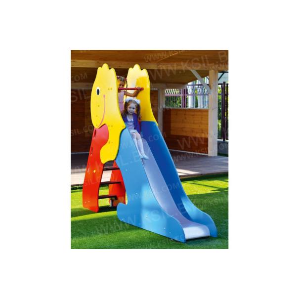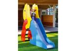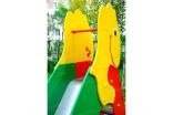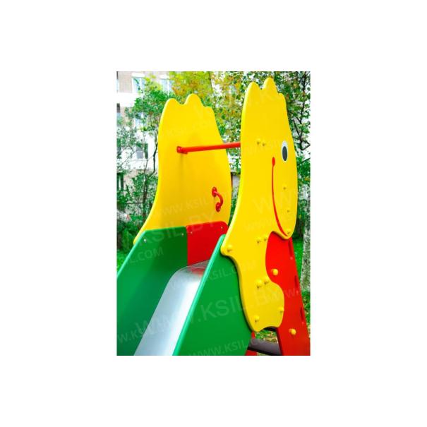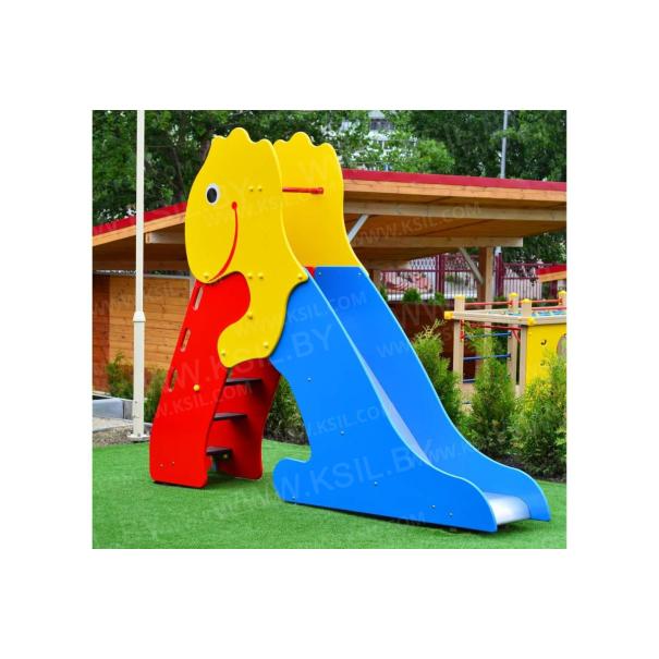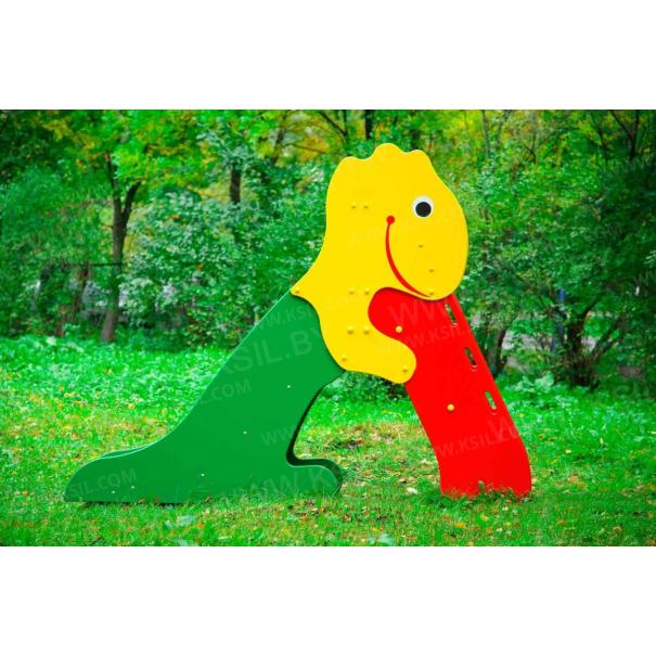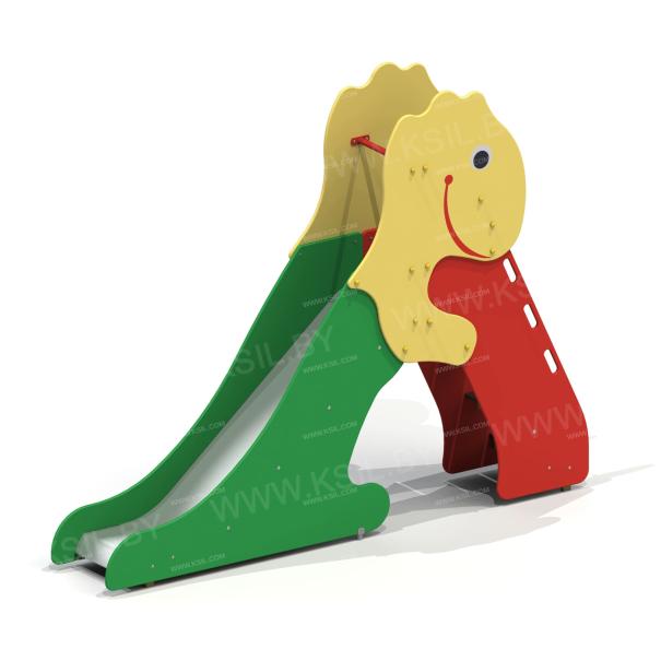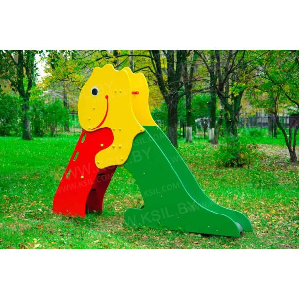 Горка должна быть стилизована под динозавра Дино и представлять собой устойчивую конструкцию, обеспечивающую безопасное движение детей по наклонной поверхности скольжения под действием силы тяжести. Горка должна состоять из площадки, каркаса, ската, бортиков, боковых стенок в виде динозавра Дино, защитной перекладины, поручней и лестницы. Горка должна иметь стартовый участок высотой не менее 1220 мм, участок скольжения и конечный участок. Скат должен быть изготовлен из единого листа нержавеющей стали толщиной 1,5 мм, утопленный в паз бортиков горки. Бортики горки, выполненнные из водостойкой фанеры толщиной не менее 21 мм должны быть высотой не менее 150 мм. Защитная перекладина должна быть выполнена из металлической трубы диаметром не менее 33 мм, побуждающая ребенка присесть и установлена на высоте не менее 600 мм от уровня поверхности стартового участка горки. Боковые стенки с вырезами для рук должны выполнять функцию защитной секции, перил лестницы и выполнены из водостойкой фанеры толщиной не менее 21 мм. Ступени лестницы должны быть выполнены из ламинированной противоскользящей водостойкой фанеры толщиной не менее 21 мм. Расстояние между ступенями должно быть одинаковым. Пол площадки стартового участка горки должен быть выполнен из водостойкой противоскользящей фанеры толщиной не менее 21 мм.