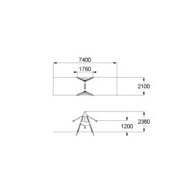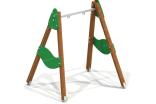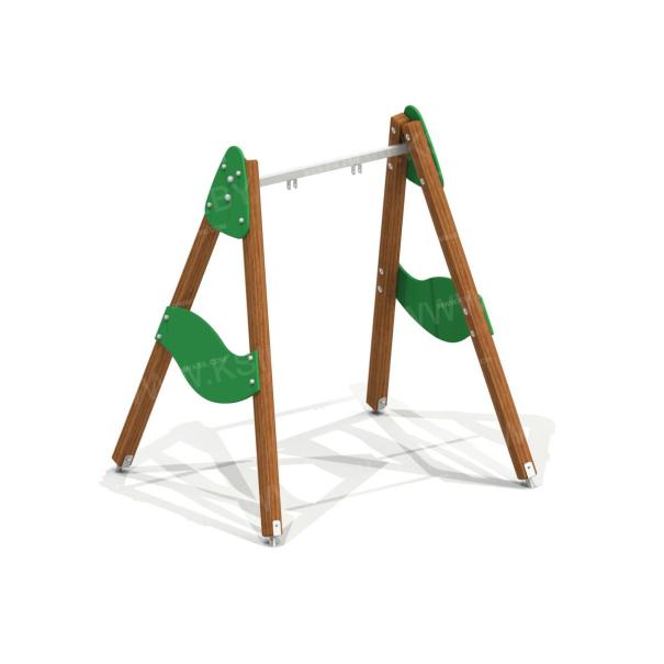 Качели односекционные должны представлять собой устойчивую конструкцию, состоящую из 4-х несущих столбов, балки, 2-х угловых накладок и 2-х декоративных элементов. Несущие столбы должны быть выполнены из клееного деревянного бруса сечением не менее 100х100 мм и иметь скругленный профиль с канавкой посередине. Сверху открытый столб должен заканчиваться пластиковой заглушкой, снизу столб должен заканчиваться металлическим оцинкованным подпятником диаметром не менее 42 мм, который бетонируется в землю. Балка должна быть выполнена из оцинкованной металлической профильной трубы сечением не менее 60х40 мм. Угловые верхние накладные и нижние декоративные элементы должны быть выполнены из влагостойкой фанеры толщиной не менее 21 мм. Крепление подвеса должно обеспечивать горизонтальное положение относительно плоскости площадки в состоянии покоя и исключать возможность обрыва цепи в месте подвески. Подвес гибкий должен быть выполнен из оцинкованной стальной цепи, изготовленной методом контактной электросварки. На поверхности цепи не должно быть трещин, ситовидной пористости, плены и расслоения. К подвесу должно крепиться плоское сиденье, выполненное из обрезиненного металла.