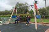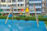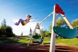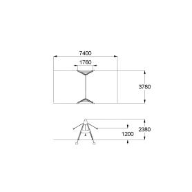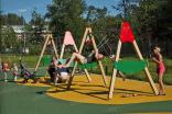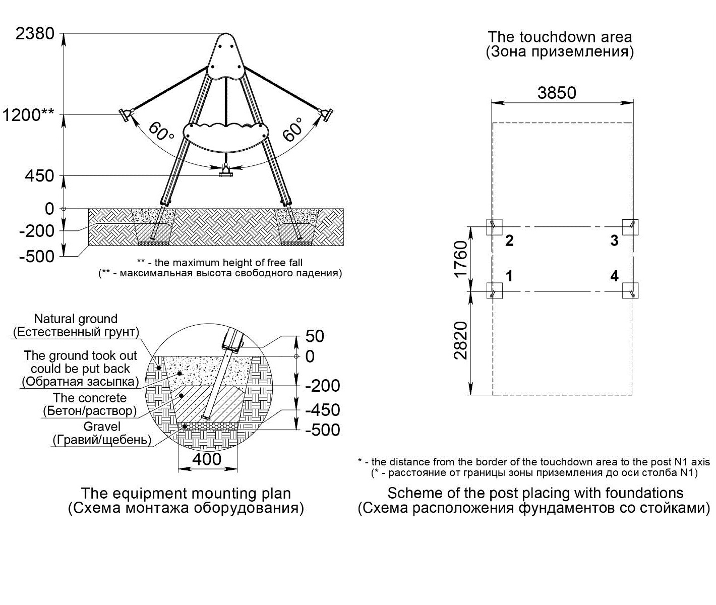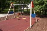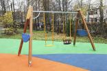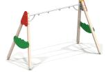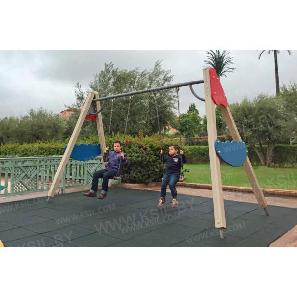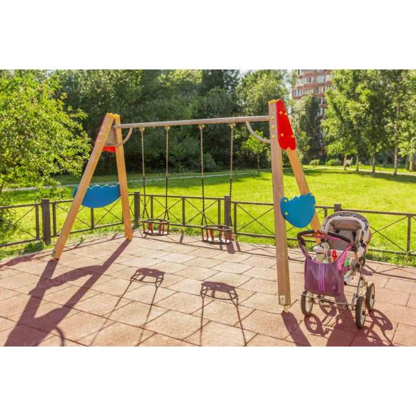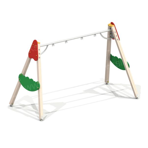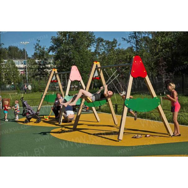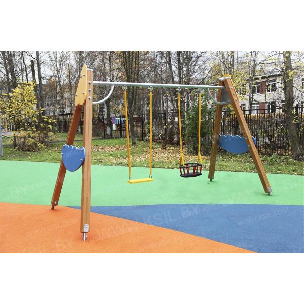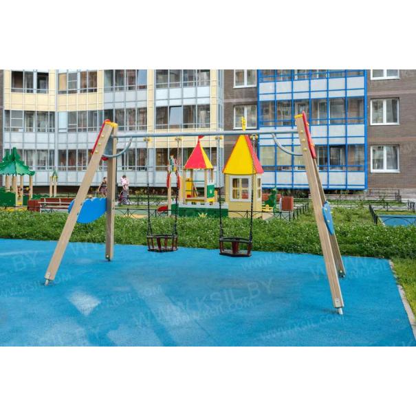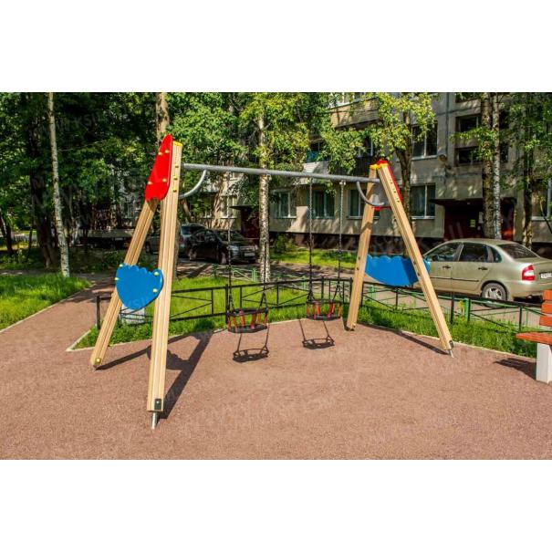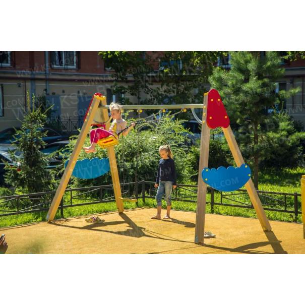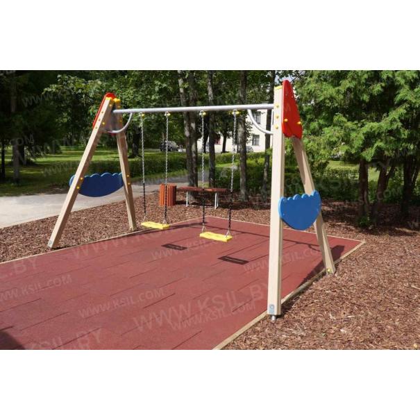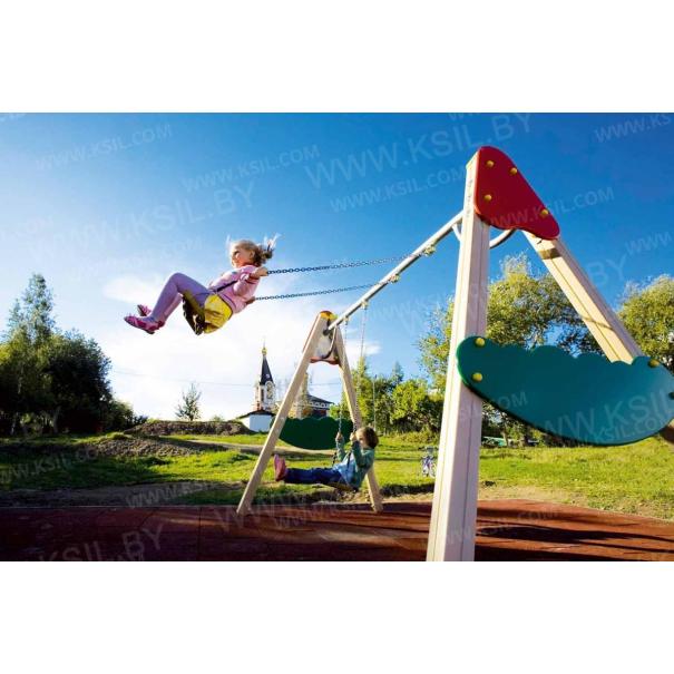 Качели односекционные должны представлять собой устойчивую конструкцию, состоящую из 4-х несущих столбов, балки, 2-х угловых накладок и 2-х декоративных элементов в виде листвы дерева. Несущие столбы должны быть выполнены из клееного деревянного бруса сечением не менее 100х100 мм и иметь скругленный профиль с канавкой посередине. Сверху открытый столб должен заканчиваться пластиковой заглушкой, снизу столб должен заканчиваться металлическим оцинкованным подпятником диаметром не менее 42 мм, который бетонируется в землю. Балка должна быть выполнена из оцинкованной металлической профильной трубы сечением не менее 60х40 мм с креплениями для одной подвески. Угловые верхние накладные и нижние декоративные элементы должны быть выполнены из влагостойкой фанеры толщиной не менее 21 мм.