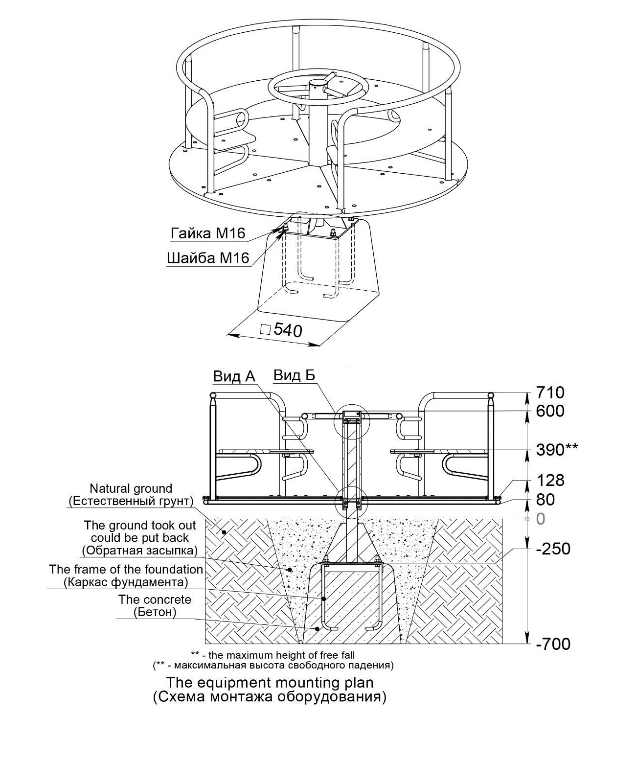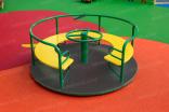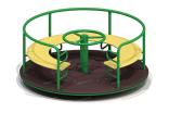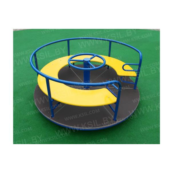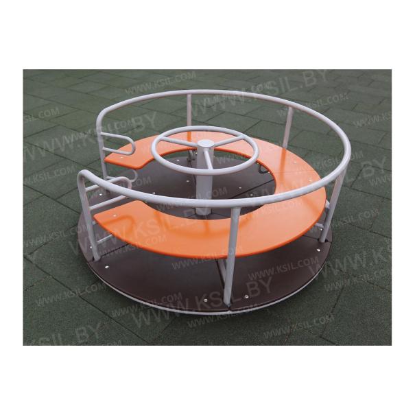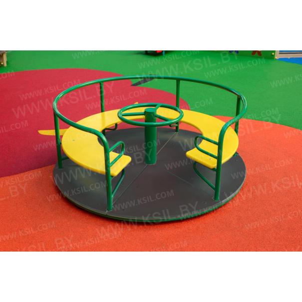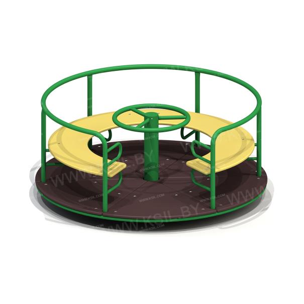 Карусель должна представлять собой устойчивую конструкцию, обеспечивающую безопасное вращение посадочных мест для детей вокруг вертикальной оси. Карусель должна состоять из опоры, центральной оси, каркаса с поручнем по периметру карусели, платформы, руля, сегментного сиденья. Под сегментным сиденьем и над сиденьем при входе на карусель должны быть установлены ребра жесткости, приваренные к каркасу. Опора должна представлять собой металлический круг диаметром не менее 60 мм и металлической платформы из листа толщиной не менее 8 мм, с приваренными к ней косынками, выполненными из металлического листа толщиной 5 мм. Центральная ось должна быть выполнена из металлической трубы диаметром не менее 100 мм. Каркас должен быть выполнен из металлических труб сечением не менее 50х25 мм и диаметром не менее 26 мм. Платформа должна быть выполнена из влагостойкой противоскользящей фанеры толщиной не менее 21 мм. Сиденье карусели должно быть выполнено из влагостойкой фанеры толщиной не менее 21 мм. Поручень и ребра жесткости должны быть выполнены из металлической трубы 33 мм.