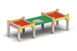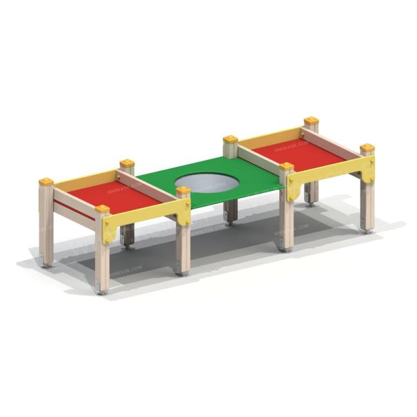 Стол - песочница должен быть предназначена для детей с ограниченными физическими возможностями представлять собой устойчивую конструкцию обеспечивающую ребенку комфортные условия для игры с песком на открытом воздухе. Стол - песочница должен состоять из 8 несущих столбов, на которых установлены 2 песочницы, одна столешница с круглым отверстием и емкостью. Несущие столбы должны быть выполнены из клееного деревянного бруса сечением не менее 100х100 мм и иметь скругленный профиль с канавкой посередине. Сверху столб должен заканчиваться пластиковой заглушкой желтого цвета, снизу столб должен заканчиваться металлическим оцинкованным подпятником диаметром не менее 42 мм, который бетонируется в землю. Песочница должна состоять из настила, боковых стенок с дугообразной нижней гранью, выполненных из водостойкой фанеры толщиной не менее 21 мм и бортов, выполненных из деревянной доски толщиной не менее 40 мм. Настил столешницы должен быть выполнен из водостойкой фанеры толщиной не менее 21 мм. Емкость должна быть выполнена из пластика.