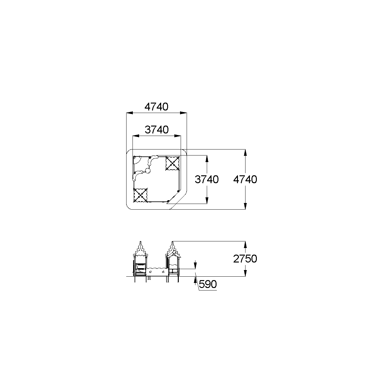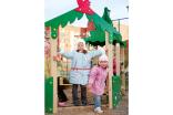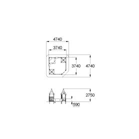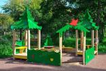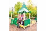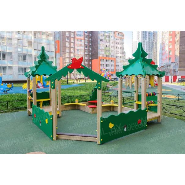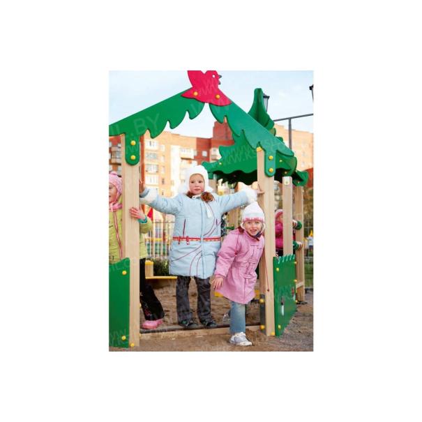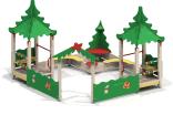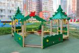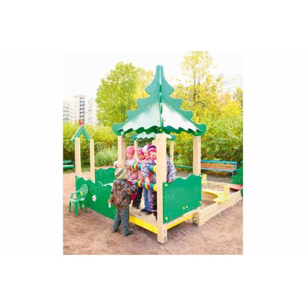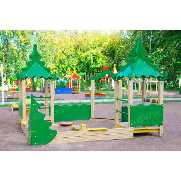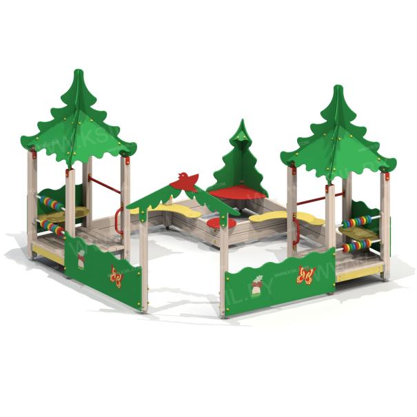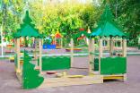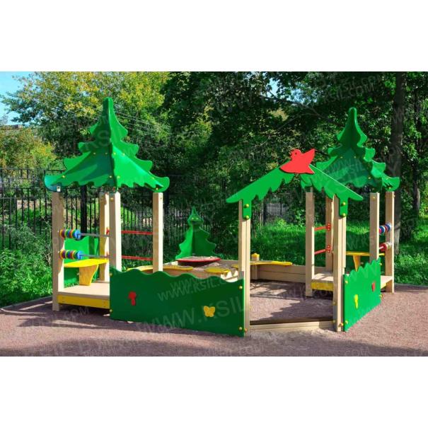 Песочный дворик должен представлять собой устойчивую, модульную конструкцию из игровых и развивающих элементов, обеспечивающие ребенку комфортные условия для игры на открытом воздухе в лесной тематике. Песочный дворик должен состоять из 2-х башен с крышами, входной арки, песочницы, ограждением по периметру и декоративными элементами. К башне 1 и к башне 2 с крышей, с высотой площадки не менее 300 мм, должны быть пристроены: счеты, ограждение фанерное с волнообразной верхней гранью, перекладины, скамейки. Несущие столбы комплекса должны быть выполнены из клееного деревянного бруса сечением не менее 100х100 мм и иметь скругленный профиль с канавкой посередине. Сверху столб должен заканчиваться пластиковой заглушкой, снизу столб должен заканчиваться металлическим оцинкованным подпятником диаметром не менее 42 мм, который бетонируется в землю. Пол башен должен быть выполнен из противоскользящей водостойкой фанеры толщиной не менее 21 мм. Ограждение 1 по периметру песочного дворика, ограждения башни 1 и башни 2, скамейки, должны быть изготовлены из водостойкой окрашенной фанеры толщиной не менее 21 мм. Входная арка должна быть установлена на несущих столбах в виде двух веток ели, выполненных из водостойкой окрашенной фанеры толщиной не менее 21 мм с птичкой из водостойкой фанеры толщиной не менее 9 мм. Песочница должна состоять из бортов, выполненных из деревянной доски толщиной не менее 40 мм, декоративного фанерного ограждения в наружном углу в форме ели и угловых накладных элементов, выполненных из водостойкой фанеры толщиной не менее 21 мм. Ограждение 2 по периметру песочного дворика должно быть выполнено из деревянной доски толщиной не менее 40 мм. Счеты должны состоять из двух металлических перекладин диаметром не менее 33 мм и пластиковых или деревянных «баранок». Перекладины и поручни должны быть выполнены из металлической трубы диаметром не менее 33 мм. Крыша башен должна состоять из 4-х скатов, выполненных из водостойкой фанеры толщиной не менее 9 мм и 4-х фронтонов из водостойкой фанеры толщиной не менее 15 мм. Декоративные элементы с лесной тематикой должны быть выполнены из водостойкой фанеры толщиной не менее 9 мм.