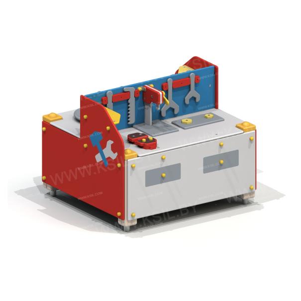 Мастерская должна представлять собой устойчивую, модульную конструкцию и состоять из игровых и развивающих элементов, обеспечивающие ребенку комфортные условия для игры на открытом воздухе. Конструкция должна состоять из рабочей двухсторонней поверхности со столешницами, перегородки, боковых стенок с художественным оформлением на заданную тематику. Мастерская должна включать в себя: полки, рабочие станки, гаечные ключи, зубила, ножовку, гайки, тиски, Несущие столбы должны быть выполнены из клееного деревянного бруса сечением не менее 100х100 мм и иметь скругленный профиль с канавкой посередине. Снизу столб должен заканчиваться металлическим оцинкованным подпятником диаметром не менее 42 мм, который бетонируется в землю. Боковые стенки, столешница, ящики, полки, перегородки должны быть выполнены из водостойкой окрашенной фанеры толщиной не менее 15 мм. Декоративные элементы должны быть выполнены из водостойкой фанеры толщиной не менее 15 мм.