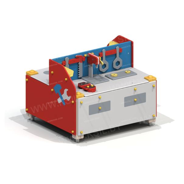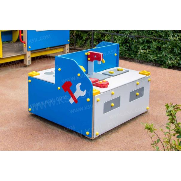 Мастерская-кухня должна представлять собой устойчивую, модульную конструкцию и состоять из игровых и развивающих элементов, обеспечивающие ребенку комфортные условия для игры на открытом воздухе. Конструкция должна состоять из рабочей, двухсторонней поверхности со столешницами, перегородка, боковых стенок с художественным оформлением на заданную тематику. Кухня должна включать в себя: плиту с конфорками, духовку, посудомойку, весы, часы, сковородки, полку. Мастерская должна включать в себя: полку, рабочий станок, гаечные ключи, зубила, ножовку, гайки, тиски. Несущие столбы должны быть выполнены из клееного деревянного бруса сечением не менее 100х100 мм и иметь скругленный профиль с канавкой посередине. Снизу столб должен заканчиваться металлическим оцинкованным подпятником диаметром не менее 42 мм, который бетонируется в землю. Боковые стенки, столешница, полки, должны быть выполнены из водостойкой окрашенной фанеры толщиной не менее 15 мм. Декоративные элементы должны быть выполнены из водостойкой фанеры толщиной не менее 9 мм.