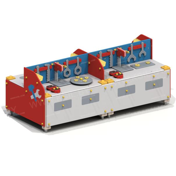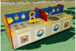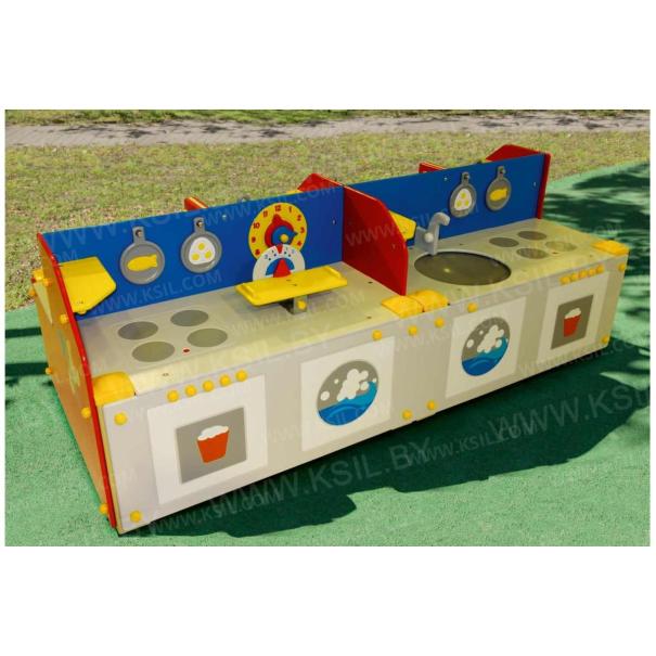 Мастерская-кухня должна представлять собой устойчивую, модульную конструкцию и состоять из игровых и развивающих элементов, обеспечивающие ребенку комфортные условия для игры на открытом воздухе. Конструкция должна состоять из рабочей двухсторонней поверхности со столешницами, перегородок, боковых стенок с художественным оформлением на заданную тематику. Кухня должна включать в себя: пластиковую мойку выпуклой формы с краном, плиту с конфорками, духовки, посудомойки, весы, часы, сковородки, полки. Мастерская должна включать в себя: полки, рабочий станок, гаечные ключи, зубила, ножовку, гайки, тиски. Несущие столбы должны быть выполнены из клееного деревянного бруса сечением не менее 100х100 мм и иметь скругленный профиль с канавкой посередине. Снизу столб должен заканчиваться металлическим оцинкованным подпятником диаметром не менее 42 мм, который бетонируется в землю. Боковые стенки, столешница, полки, перегородки должны быть выполнены из водостойкой окрашенной фанеры толщиной не менее 21 мм. Декоративные элементы должны быть выполнены из водостойкой фанеры толщиной не менее 9 мм.