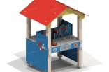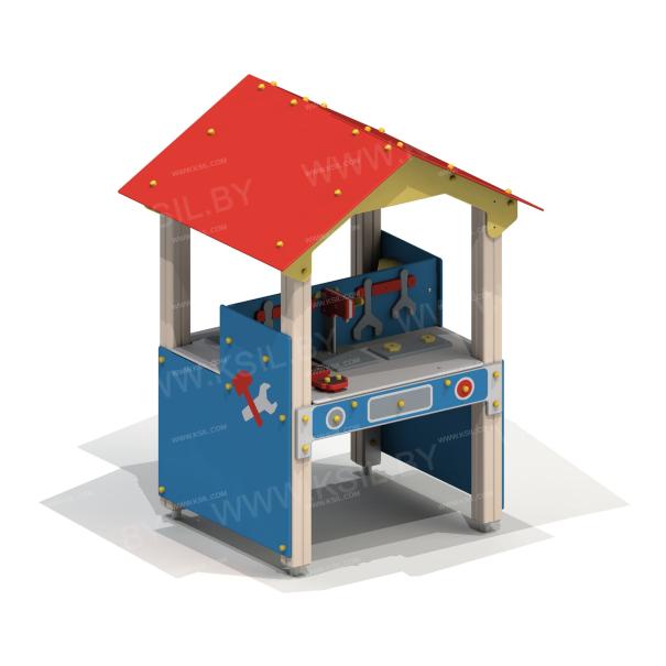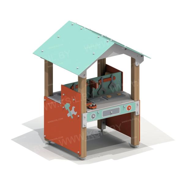 Мастерская-кухня должна представлять собой устойчивую, модульную конструкцию для детей с ограниченными физическими возможностями и состоять из игровых и развивающих элементов, обеспечивающие ребенку комфортные условия для игры на открытом воздухе. Конструкция должна состоять из башни с крышей . К башне должны быть пристроены: столешница, перегородка, боковые стенки с художественным оформлением на заданную тематику, кухня и мастерская. Кухня должна включать в себя: пластиковую мойку выпуклой формы с краном, плиту с конфорками, часы, сковородки, полку. Мастерская должна включать в себя: полку, рабочий станок, гаечные ключи, зубила, ножовку, гайки, тиски. Несущие столбы должны быть выполнены из клееного деревянного бруса сечением не менее 100х100 мм и иметь скругленный профиль с канавкой посередине. Снизу столб должен заканчиваться металлическим оцинкованным подпятником диаметром не менее 42 мм, который бетонируется в землю. Боковые стенки, столешница, полки, перегородки должны быть выполнены из водостойкой окрашенной фанеры толщиной не менее 21 мм. Декоративные элементы должны быть выполнены из водостойкой фанеры толщиной не менее 9 мм. Крыша двухскатная должна состоять из скатов и фронтонов выполненных из водостойкой фанеры толщиной не менее 21 мм.