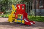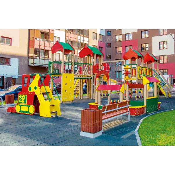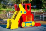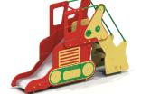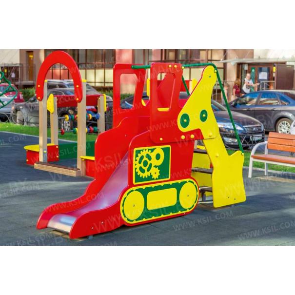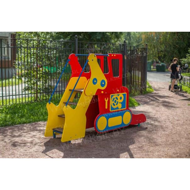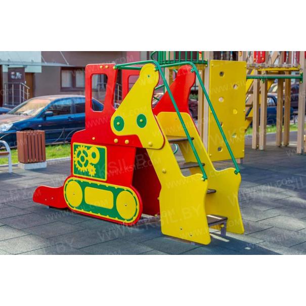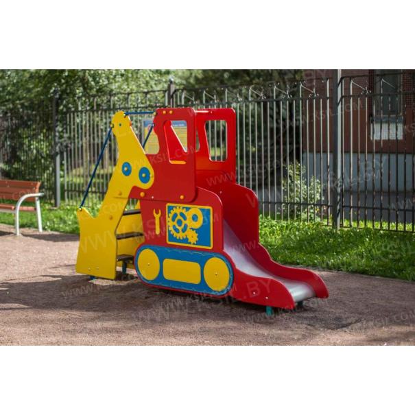 Горка должна представлять собой устойчивую конструкцию, обеспечивающую безопасное движение детей по наклонной поверхности скольжения под действием силы тяжести. Горка должна состоять из стартовой площадки, ската, бортиков, защитной секции с защитной перекладиной и лестницей и боковыми бортами имитирующие корпус экскаватора. Горка должна иметь стартовый участок высотой не менее 950 мм, участок скольжения и конечный участок. Скат должен быть изготовлен из единого листа нержавеющей стали толщиной 1,5 мм, утопленный в паз бортиков горки. Бортики горки должны быть высотой не менее 100 мм. Защитная перекладина должна быть выполнена из металлической трубы диаметром не менее 33 мм, побуждающая ребенка присесть и установлена на высоте не менее 600 мм от уровня поверхности стартового участка горки. Защитная секция горки с окошками должна быть выполнена из влагостойкой фанеры толщиной не менее 21 мм. Лестница должна быть оснащена бортами, выполненные из влагостойкой фанеры толщиной не менее 21 мм и имитирующие стрелу, рукоять и ковш экскаватора. К бортам должны крепиться перила лестницы, выполненные из металлической трубы диаметром не менее 21 мм. Ступени лестницы должны быть выполнены из ламинированной противоскользящей влагостойкой фанеры толщиной не менее 21 мм. Расстояние между ступенями должно быть одинаковым. Ограждения площадки должны быть выполнены из металлических перекладин диаметром не менее 26 мм и крепиться между защитной секцией горки и стрелой экскаватора. Боковые борта горки, имитирующие корпус экскаватора должны быть выполнены из влагостойкой фанеры толщиной не менее 21 мм. Пол площадки стартового участка горки должен быть выполнен из влагостойкой противоскользящей фанеры толщиной не менее 21 мм.
