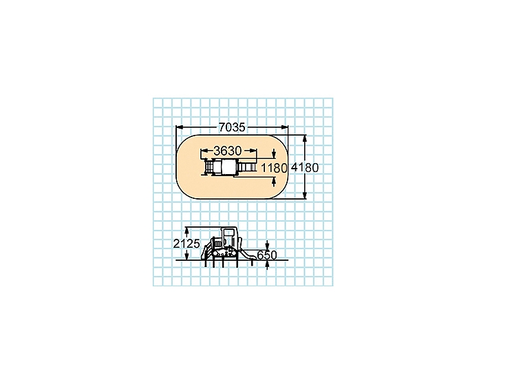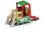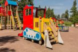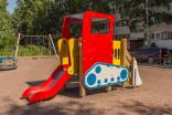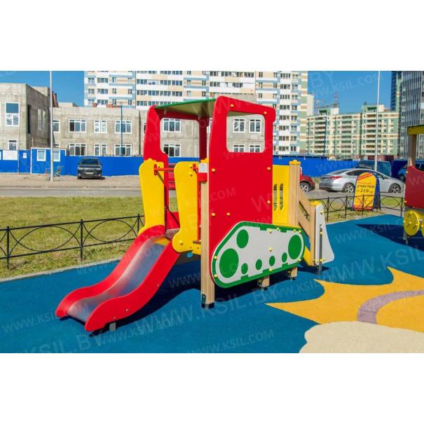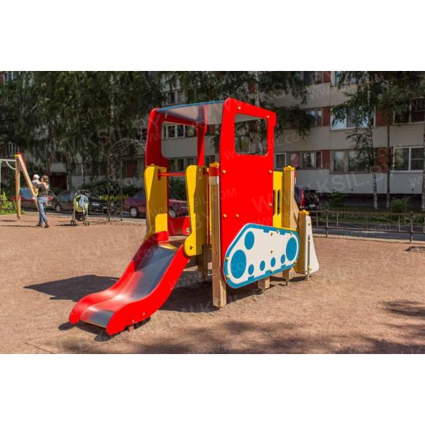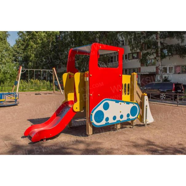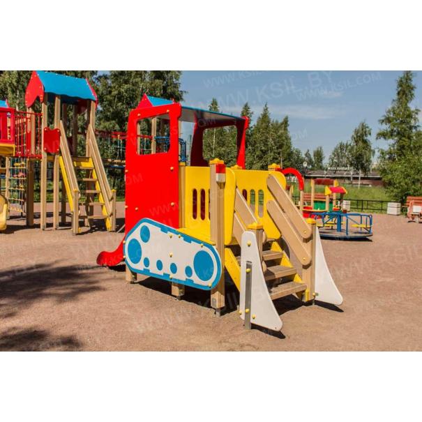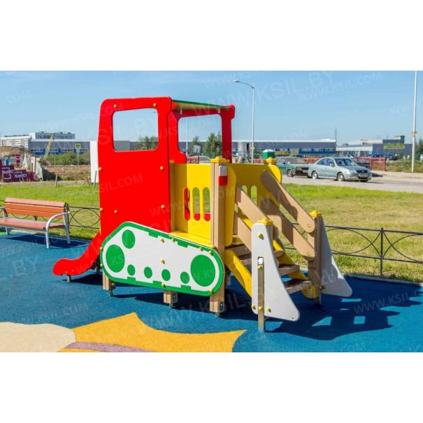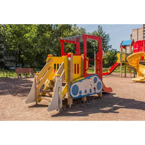 Детский игровой комплекс должен представлять собой устойчивую, модульную конструкцию из игровых и развивающих элементов, стилизованных под бульдозер. Бульдозер должен состоять из башни с полубашней. К башне с крышей, с высотой площадки не менее 650 мм, должны быть пристроены: боковая стенка с входом и поручнями, боковая стенка с окошком, горка. К полубашне, с высотой площадки не менее 650 мм, должны быть пристроены: лестница, фанерные ограждения. По боковым сторонам конструкции должны крепиться стенки с отверстиями для ног в виде ходовой части гусеничного трактора. Несущие столбы комплекса должны быть выполнены из клееного деревянного бруса сечением не менее 100х100 мм и иметь скругленный профиль с канавкой посередине. Снизу столб должен заканчиваться металлическим оцинкованным подпятником диаметром не менее 42 мм, который бетонируется в землю. Пол башни и полубашни должен быть выполнен из влагостойкой ламинированной фанеры толщиной не менее 21 мм. Стенки бульдозера, ограждения должны быть изготовлены из влагостойкой окрашенной фанеры толщиной не менее 21 мм. Крыша должна быть изготовлена из влагостойкой окрашенной фанеры толщиной не менее 15 мм. Поручни должны быть выполнены из металлических труб диаметром не менее 33 мм. Лестница высотой не менее 650 мм должна быть оснащена перилами, выполненными из деревянной доски толщиной не менее 40 мм. Перила должны быть установлены от первой ступени. Ступени лестниц должны быть выполнены из ламинированной противоскользящей влагостойкой фанеры толщиной не менее 15 мм и деревянной доски толщиной 40 мм, склеенных между собой. Расстояние между ступенями должно быть одинаковым. К лестнице должны крепиться декоративные отвалы, выполненные из влагостойкой фанеры толщиной не менее 21 мм. Горка должна состоять из ската, бортиков, защитной секции и защитной перекладины. Горка должна иметь стартовый участок высотой не менее 650 мм, участок скольжения и конечный участок. Скат должен быть изготовлен из единого листа нержавеющей стали толщиной 1,5 мм, утопленный в паз бортиков горки. Бортики горки, выполненные из влагостойкой фанеры толщиной не менее 21 мм должны быть высотой не менее 100 мм. Защитная перекладина должна быть выполнена из металлической трубы диаметром не менее 33 мм, побуждающая ребенка присесть и установлена на высоте не менее 600 мм от уровня поверхности стартового участка горки. Защитная секция горки должна быть выполнена из влагостойкой фанеры толщиной не менее 21 мм.