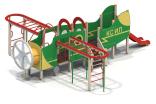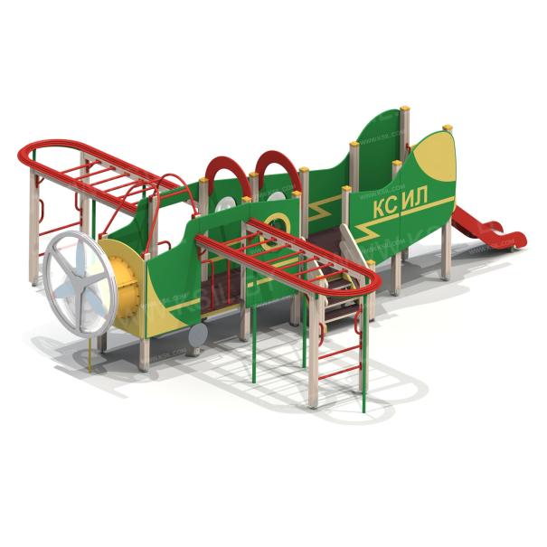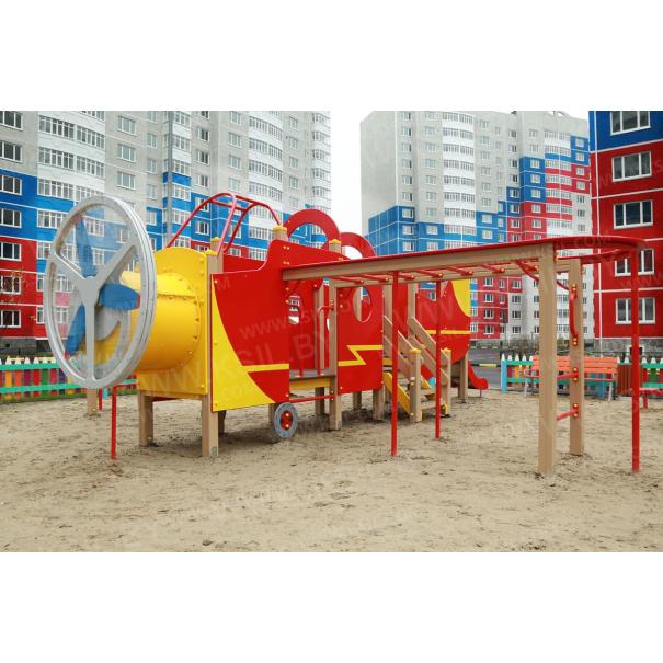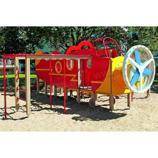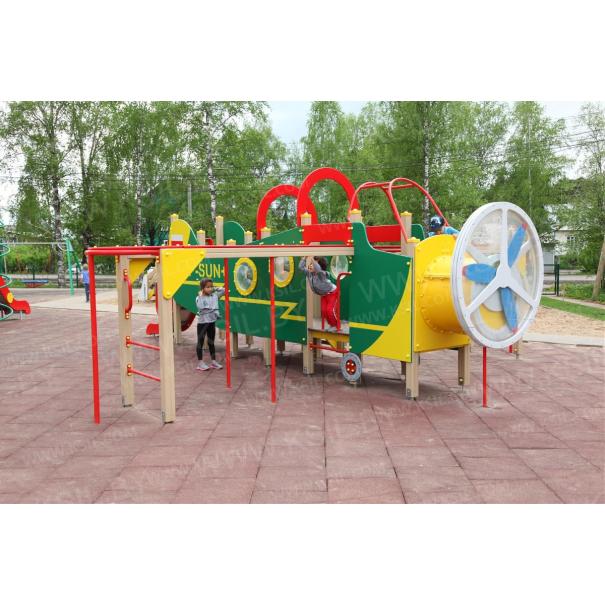 Детский игровой комплекс должен представлять собой устойчивую, модульную конструкцию из игровых и развивающих элементов, стилизованных под самолет. Самолет должен состоять из носовой части, кабины, фюзеляжа, крыльев, хвостовой части. Кабина самолета должна иметь штурвал с сидениями и приборную панель. Вращающиеся лопасти пропеллера, установленные в носовой части должны быть закрыты с 2-х сторон поликарбонатным листом, толщиной не менее 6 мм. По бокам самолета должны быть установлены крылья, выполненные в виде двух вынесенных шведских стенок с поручнями, рукоходами с несущими стойками и с фанерными накладными элементами по периметру рукохода. Вход на самолет должен осуществляться через проемы с поручнями, установленные по бокам кабины и через лестницу, установленную в центральной части самолета. К хвостовой части самолета должна крепиться горка. Фюзеляж самолета должен быть оснащен декоративными арками, установленными на несущих столбах, боковыми стенками и стенками с иллюминаторами. Пол самолета должен быть выполнен из влагостойкой фанеры толщиной не менее 21 мм. В нижней части несущих столбов должны крепиться декоративные элементы в виде шасси самолета. Несущие столбы комплекса должны быть выполнены из клееного деревянного бруса сечением не менее 100х100 мм и иметь скругленный профиль с канавкой посередине. Сверху столб должен заканчиваться пластиковой заглушкой, снизу столб должен заканчиваться металлическим оцинкованным подпятником диаметром не менее 42 мм, который бетонируется в землю. Сиденья, стенки с иллюминаторами, арки, боковые стенки, накладные элементы крыльев, панель приборов должны быть изготовлены из влагостойкой фанеры толщиной не менее 21 мм. Перекладины шведской стенки, перекладины рукохода, несущие стойки рукохода, поручни должны быть выполнены из металлической трубы диаметром не менее 33 мм. Горка должна состоять из ската, бортиков, защитной секции и защитной перекладины. Горка должна иметь стартовый участок высотой не менее 950 мм, участок скольжения и конечный участок. Скат должен быть изготовлен из единого листа нержавеющей стали толщиной 1,5 мм, утопленный в паз бортиков горки. Бортики горки, выполненные из влагостойкой фанеры толщиной не менее 21 мм должны быть высотой не менее 100 мм. Защитная перекладина должна быть выполнена из металлической трубы диаметром не менее 33 мм, побуждающая ребенка присесть и установлена на высоте не менее 700 мм от уровня поверхности стартового участка горки. Защитная секция горки должна быть выполнена из влагостойкой фанеры толщиной не менее 21 мм. Лестница должна быть оснащена перилами, выполненные из деревянной доски толщиной не менее 40 мм. Перила должны быть установлены от первой ступени. Ступени лестниц должны быть выполнены из ламинированной противоскользящей влагостойкой фанеры толщиной не менее 15 мм и деревянной доски толщиной 40 мм, склеенных между собой. Расстояние между ступенями должно быть одинаковым.
