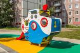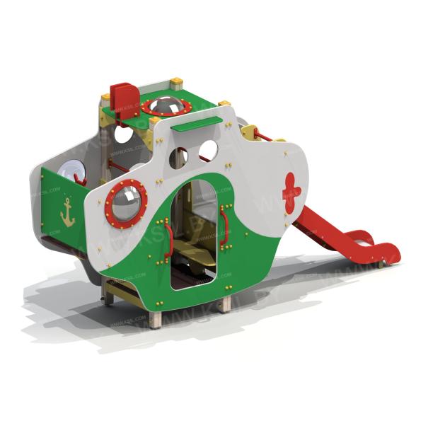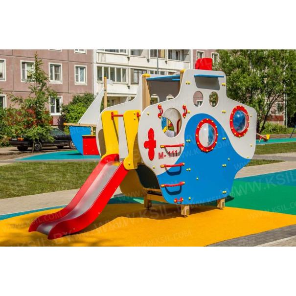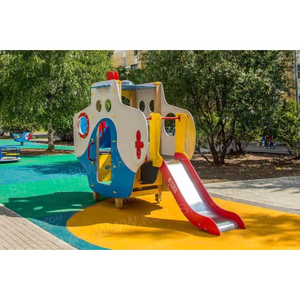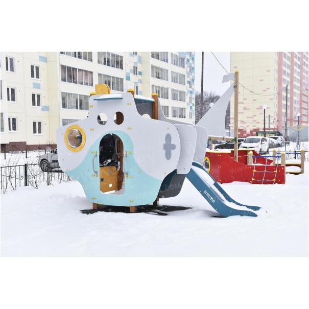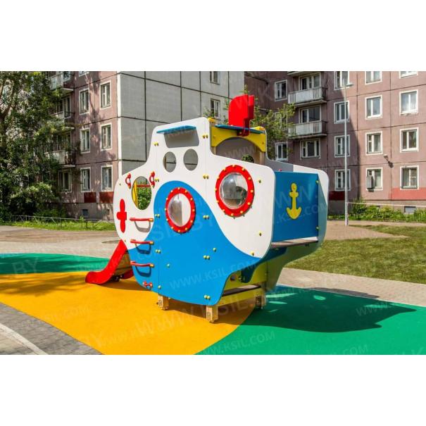 Детский игровой комплекс должен представлять собой модульную сборно-разборную конструкцию в виде подводной лодки «Наутилус». Подводная лодка должна включать в себя боковые стенки с входами, один в виде арки, другой в виде люка с ведущими к нему поручнями, горку, альпинистскую стенку, три разных по уровню внутренних отсека. Подводная лодка должна быть стилизована окнами-иллюминаторами и декоративным перископом. Несущие столбы комплекса должны быть выполнены из клееного деревянного бруса сечением не менее 100х100 мм и иметь скругленный профиль с канавкой посередине. Сверху столб должен заканчиваться пластиковой заглушкой желтого цвета, снизу столб должен заканчиваться металлическим оцинкованным подпятником диаметром не менее 42 мм, который бетонируется в землю. Пол башни должен быть выполнен из влагостойкой противоскользящей фанеры толщиной не менее 21 мм. Горка должна состоять из ската, бортиков, защитной секции и защитной перекладины. Горка должна иметь стартовый участок высотой не менее 950 мм, участок скольжения и конечный участок. Скат должен быть изготовлен из единого листа нержавеющей стали толщиной 1,5 мм, утопленный в паз бортиков горки. Бортики горки должны быть высотой не менее 100 мм. Защитная перекладина должна быть выполнена из металлической трубы диаметром не менее 33 мм, побуждающая ребенка присесть и установлена на высоте не менее 600 мм от уровня поверхности стартового участка горки. Защитная секция горки должна быть выполнена из влагостойкой фанеры толщиной не менее 21 мм. Перекладины, поручни должны быть выполнены из металлической трубы диаметром не менее 33 мм. Альпинистская стенка с отверстиями для рук и ног, перископ, стенки, крыша, должны быть выполнены из влагостойкой фанеры толщиной не менее 21 мм. Декоративные элементы в виде якоря, винта должны быть выполнены из влагостойкой фанеры толщиной не менее 9 мм.