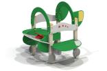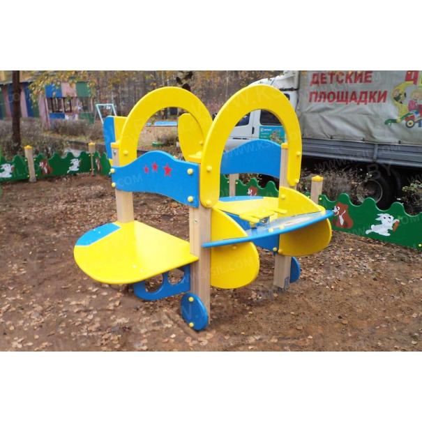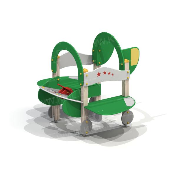 Детский игровой комплекс должен представлять собой устойчивую, модульную конструкцию из игровых и развивающих элементов, стилизованных под самолет для детей с ограниченными физическими возможностями. Самолетик представляет собой конструкцию из несущих стоек, сидений, имитирующих крылья самолета, имитации арок, столика имитирующего кабину пилота, усиливающих элементов, имитирующих двигатель самолета, ограждений, декоративных элементов в виде шасси самолета, стабилизаторов высоты. Несущие стойки должны располагаться в углах условного квадрата, выполнены из клееного деревянного бруса сечением не менее 100х100 мм и иметь скругленный профиль с канавкой посередине. Сверху столб должен заканчиваться пластиковой заглушкой желтого цвета, снизу столб должен заканчиваться металлическим оцинкованным подпятником диаметром не менее 42 мм, который бетонируется в землю. Сиденья, арки, столик, усиливающие элементы, ограждения, декоративные элементы в виде шасси самолета, стабилизаторы высоты должны быть выполнены из водостойкой фанеры толщиной не менее 21 мм.