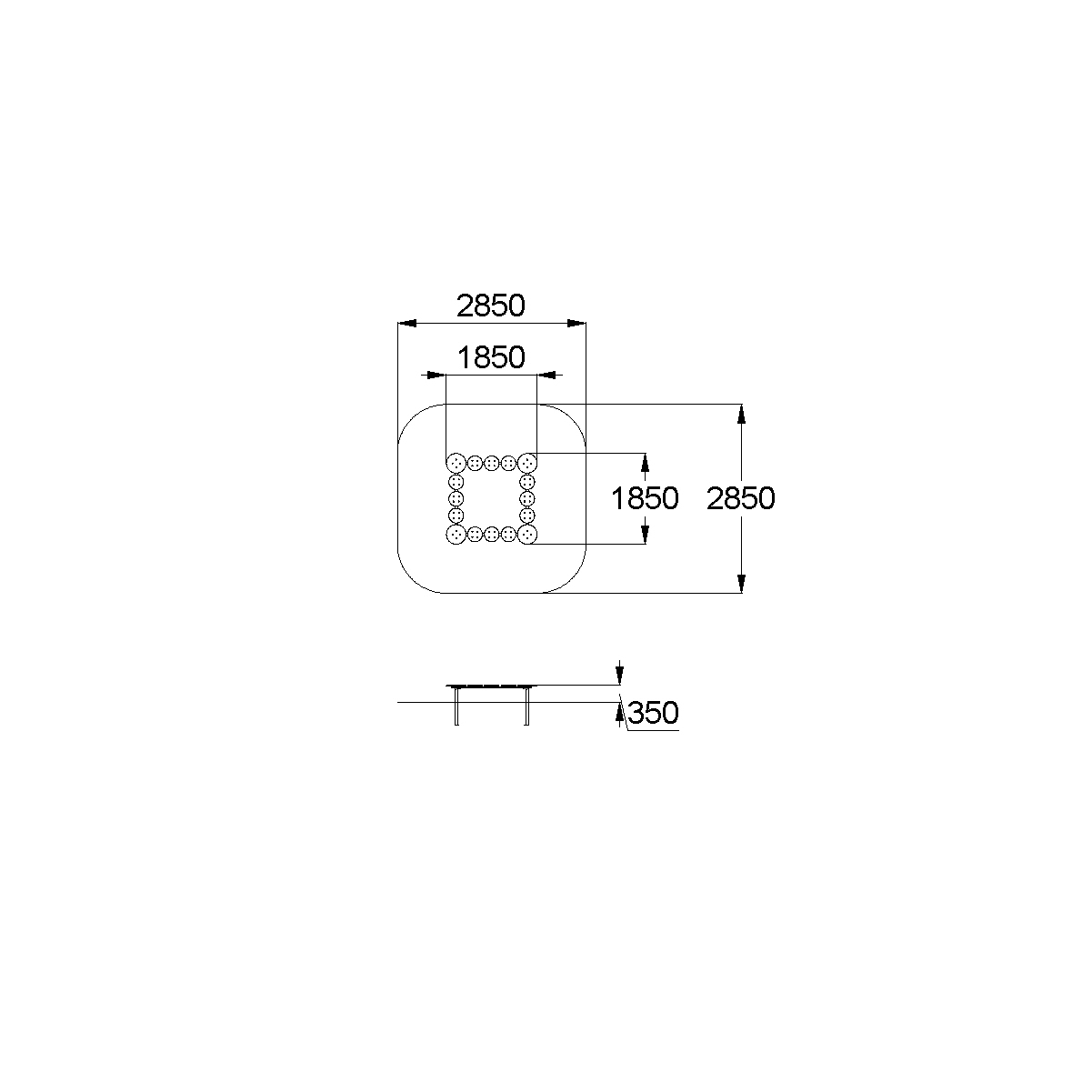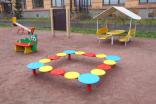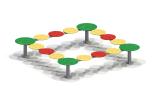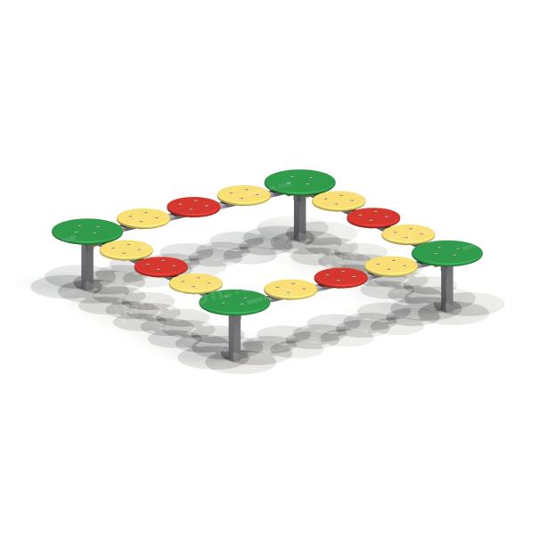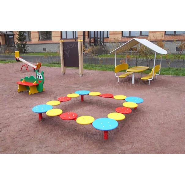 Игровой элемент представляет собой устойчивую конструкцию, состоящую из каркаса, 4-х опорных стоек из металлической профильной трубы сечением 50х25 мм, основание которых бетонируется в землю 4-х больших и 12-ти малых сидений круглой формы, диаметрами 300 мм и 400 мм. Сиденья и опорные стойки должны быть расположены таким образом, чтобы прохождение дорожки осуществлялось по квадратной траектории. Сиденья изготовлены из влагостойкой фанеры толщиной 21 мм.