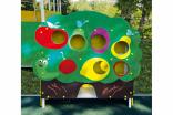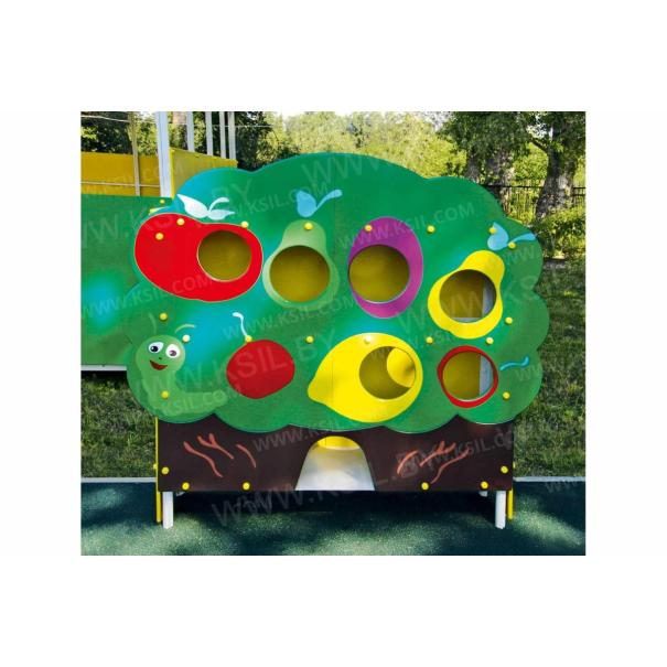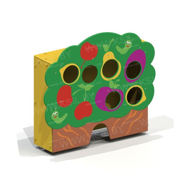 Стенка для метания мячиков должна представлять собой устойчивую конструкцию, состоящую из каркаса, передней стенки с отверстиями в виде фруктового дерева с художественной росписью, боковых и задней стенки. Металлический каркас должен быть выполнен из профильной трубы сечением не менее 50х25 мм, круглой трубы диаметром не менее 42 мм, уголка сечением не менее 50х50 мм и металлического листа толщиной не менее 4 мм. Металлические подпятники должны бетонироваться в землю. Стенки должны быть выполнены из водостойкой фанеры толщиной не менее 21 мм.