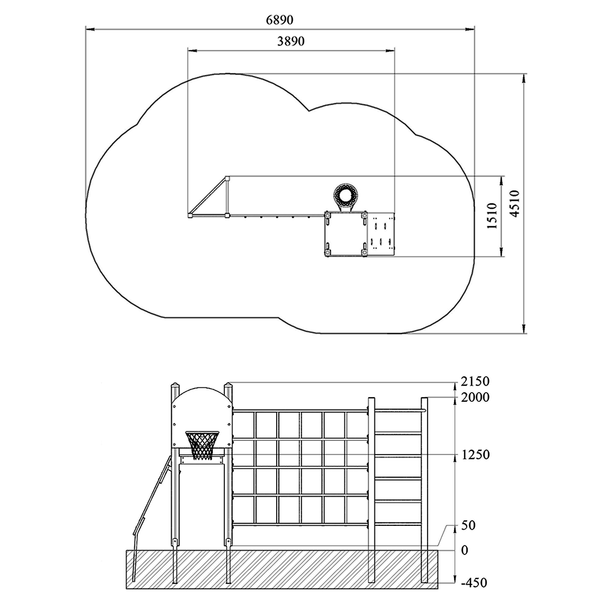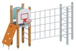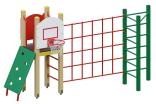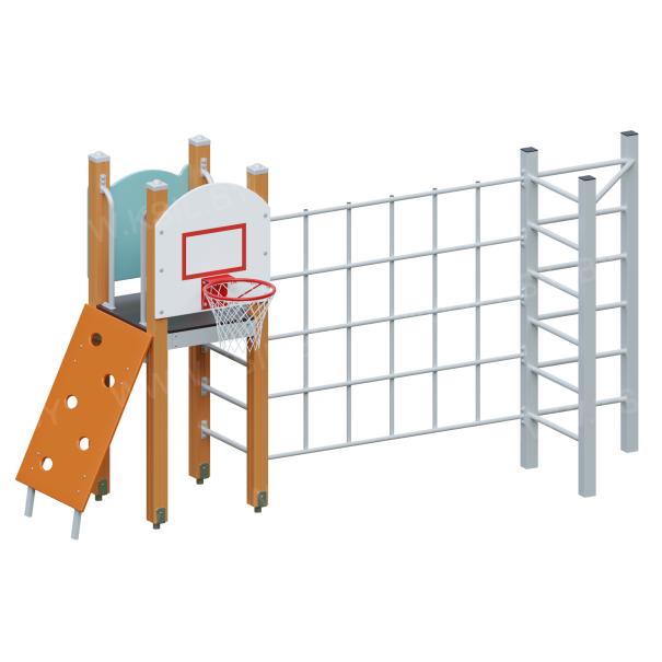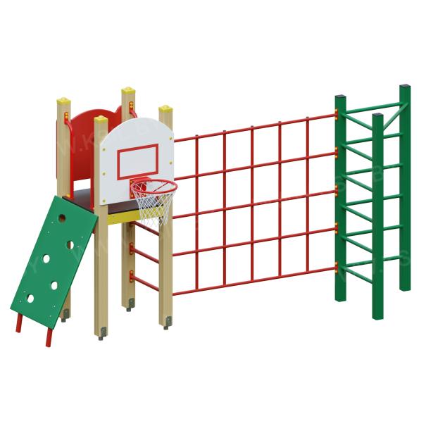 Спортивный комплекс должен представлять собой модульную сборно-разборную конструкцию и состоять из башни и гимнастического комплекса, соединенные между собой вертикальной металлической сеткой. К башне, с высотой площадки не менее 1250 мм, должны быть пристроены: наклонная альпинистская стенка с отверстиями для рук и ног, вертикальная лестница, 2 фанерных ограждения с волнообразной верхней гранью , одно из них с баскетбольным кольцом, поручни. Гимнастический комплекс должен состоять из шведской стенки металлической сварной. Несущие разновысокие столбы комплекса должны быть выполнены из клееного деревянного бруса сечением не менее 100х100 мм и иметь скругленный профиль с канавкой посередине. Сверху столб должен заканчиваться пластиковой заглушкой, снизу столб должен заканчиваться металлическим оцинкованным подпятником диаметром не менее 42 мм, который бетонируется в землю. Пол башни должен быть выполнен из ламинированной противоскользящей водостойкой фанеры толщиной не менее 21 мм. Альпинистская стенка должна быть изготовлена из водостойкой окрашенной фанеры толщиной не менее 21 мм. Ограждение башни должно быть изготовлено из водостойкой окрашенной фанеры толщиной не менее 21 мм. Перекладины металлической сетки, поручни, перекладины шведской стенки должны быть выполнены из металлической трубы диаметром не менее 33 мм.