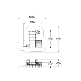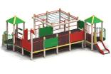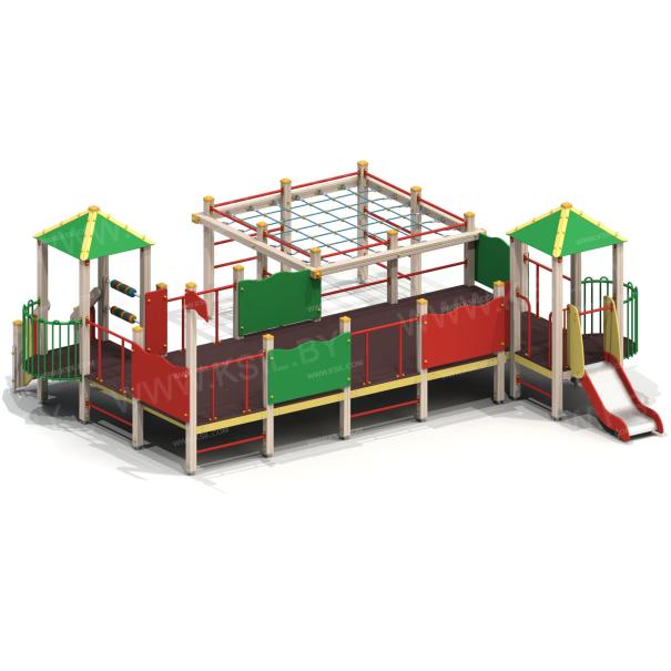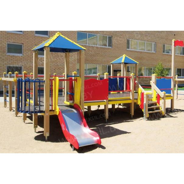 Детский игровой комплекс должен представлять собой модульную, сборно-разборную конструкцию, состоящую из 2-х башен с крышами и единой площадки с вынесенным гимнастическим комплексом. К единой площадке должна быть пристроена лестница. Несущие столбы должны быть выполнены из клееного деревянного бруса сечением не менее 100х100 мм и иметь скругленный профиль с канавкой посередине. Сверху столб должен заканчиваться пластиковой заглушкой, снизу столб должен заканчиваться металлическим оцинкованным подпятником диаметром не менее 42 мм, который бетонируется в землю. К башне 1 с крышей, с высотой площадки не менее 647 мм должны быть пристроены: горка, перекладины, поручни, радиусный балкон. К башне 2 с крышей, с высотой площадки не менее 647 мм должны быть пристроены: фанерное ограждение, радиусный балкон, счеты. К единой площадке должны быть пристроены перекладины и фанерные ограждения, декоративный флаг, крепящийся к несущему столбу. Вынесенный гимнастический комплекс должен представлять собой конструкцию, состоящую из несущих столбов, установленных в три ряда, параллельно друг другу. В крайних рядах должно быть по три несущих столбов, расположенных на равном расстоянии друг от друга, в среднем ряду по два столба. В каждом ряду несущие стойки в верхней части должны быть соединены балками и горизонтальными столбами. В верхней части должна быть расположена полипропиленовая сетка, проемы гимнастического комплекса должны быть оснащены: шведскими стенками. Несущие столбы комплекса должны быть выполнены из клееного деревянного бруса сечением не менее 100х100 мм и иметь скругленный профиль с канавкой посередине. Сверху столб должен заканчиваться пластиковой заглушкой желтого цвета, снизу столб должен заканчиваться металлическим оцинкованным подпятником диаметром не менее 42 мм, который бетонируется в землю. Крыша башен должна состоять из 4-х скатов и 4-х наличников, выполненных из влагостойкой фанеры толщиной не менее 9 мм и соединенных между собой в верхней части колпаком. Полы единой площадки и башни должны быть выполнены из влагостойкой противоскользящей фанеры толщиной не менее 21 мм. Горка должна состоять из ската, бортиков, защитной секции и защитной перекладины. Горка должна иметь стартовый участок высотой не менее 647 мм, участок скольжения и конечный участок. Скат должен быть изготовлен из единого листа нержавеющей стали толщиной 1,5 мм, утопленный в паз бортиков горки. Бортики горки, выполненные из влагостойкой фанеры толщиной не менее 21 мм должны быть высотой не менее 100 мм. Защитная перекладина должна быть выполнена из металлической трубы диаметром не менее 33 мм, побуждающая ребенка присесть и установлена на высоте не менее 600 мм от уровня поверхности стартового участка горки. Защитная секция горки должна быть выполнена из влагостойкой фанеры толщиной не менее 21 мм. Радиусный балкон должен состоять из пола, выполненного из влагостойкой ламинированной противоскользящей фанеры толщиной не менее 21 мм и радиусного металлического ограждения из труб диаметрами не менее 21 мм и не менее 33 мм. Перекладины, перекладины шведской стенки, поручни, балки гимнастического комплекса должны быть выполнены из металлической трубы диаметром не менее 33 мм. Лестница высотой не менее 647 мм должна быть оснащена перилами, выполненные из деревянной