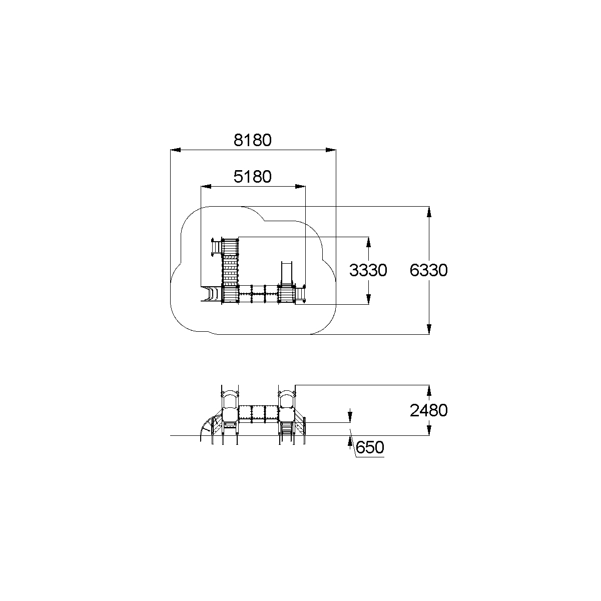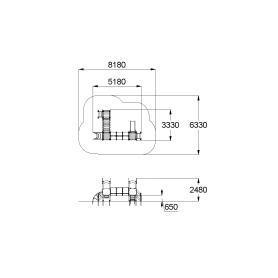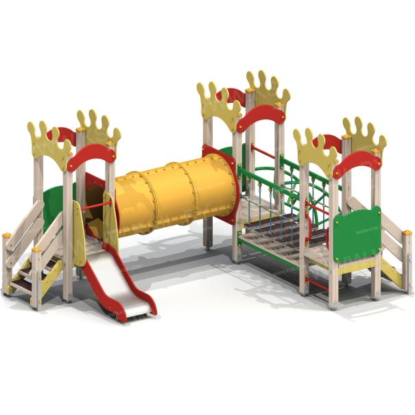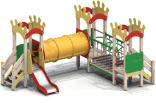 Детский игровой комплекс должен представлять собой модульную сборно-разборную конструкцию, состоящую из 3-х башен с имитацией крыши, стилизованной под корону и соединенных между собой подвесным мостом и тоннельным переходом. К башне 1 должны быть пристроены: горка, лестница, фанерное ограждение с декоративным накладным элементом. К башне 2 должны быть пристроены: фанерное ограждение с декоративным накладным элементом, наклонная лиана, перекладина. К башне 3 должны быть пристроены: фанерное ограждение с декоративным накладным элементом, лестница, перекладины. Несущие столбы комплекса должны быть выполнены из клееного деревянного бруса сечением не менее 100х100 мм и иметь скругленный профиль с канавкой посередине. Сверху столб должен заканчиваться пластиковой заглушкой, снизу столб должен заканчиваться металлическим оцинкованным подпятником диаметром не менее 42 мм, который бетонируется в землю. Пол башен должен быть выполнен из деревянной доски толщиной не менее 40 мм. Имитация крыши башен должна состоять из 2–х фигурных и 2- х дугообразных накладных элементов, выполненных из влагостойкой фанеры толщиной не менее 21 мм. Горка должна состоять из ската, бортиков, защитной секции и защитной перекладины. Горка должна иметь стартовый участок высотой не менее 650 мм, участок скольжения и конечный участок. Скат должен быть изготовлен из единого листа нержавеющей стали толщиной 1,5 мм, утопленный в паз бортиков горки. Бортики горки, выполненные из влагостойкой фанеры толщиной не менее 21 мм должны быть высотой не менее 100 мм. Защитная перекладина должна быть выполнена из металлической трубы диаметром не менее 33 мм, побуждающая ребенка присесть и установлена на высоте не менее 600 мм от уровня поверхности стартового участка горки. Защитная секция горки должна быть выполнена из влагостойкой фанеры толщиной не менее 21 мм. Лестница высотой не менее 650 мм должна быть оснащена перилами, выполненные из деревянной доски толщиной не менее 40 мм. Перила должны быть установлены от первой ступени. Ступени лестниц должны быть выполнены из ламинированной противоскользящей влагостойкой фанеры толщиной не менее 15 мм и деревянной доски толщиной 40 мм, склеенных между собой. Расстояние между ступенями должно быть одинаковым. Ограждения должны быть выполнены из влагостойкой фанеры толщиной не менее 21 мм. Декоративные элементы должны быть выполнены из влагостойкой фанеры толщиной не менее 9 мм. Перекладины должны быть выполнены из металлической трубы диаметром не менее 33 мм. Наклонная лиана должна состоять их 2-х наклонных дуг выполненных из металлической трубы диаметром не менее 42 мм и П-образных ступенек из трубы диаметром не менее 33 мм. Подвесной мост должен состоять из страховочного моста, подвесного моста со ступеньками и перил. Ступеньки должны быть выполнены из влагостойкой ламинированной фанеры толщиной не менее 15 мм и доски толщиной не менее 40 мм склеенных между собой, каждая ступень должна крепиться к полиамидным канатам, диаметром не менее 16 мм. Канат должен крепиться к перилам мостика, выполненных из металлической трубы сечением не менее 60х30 мм. Страховочный мост должен быть выполнен из деревянной доски толщиной не менее 40 мм. Тоннельный переход должен состоять из пластиковых сегментов и двух стенок-входов с круглым отверстием, равным вн