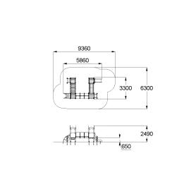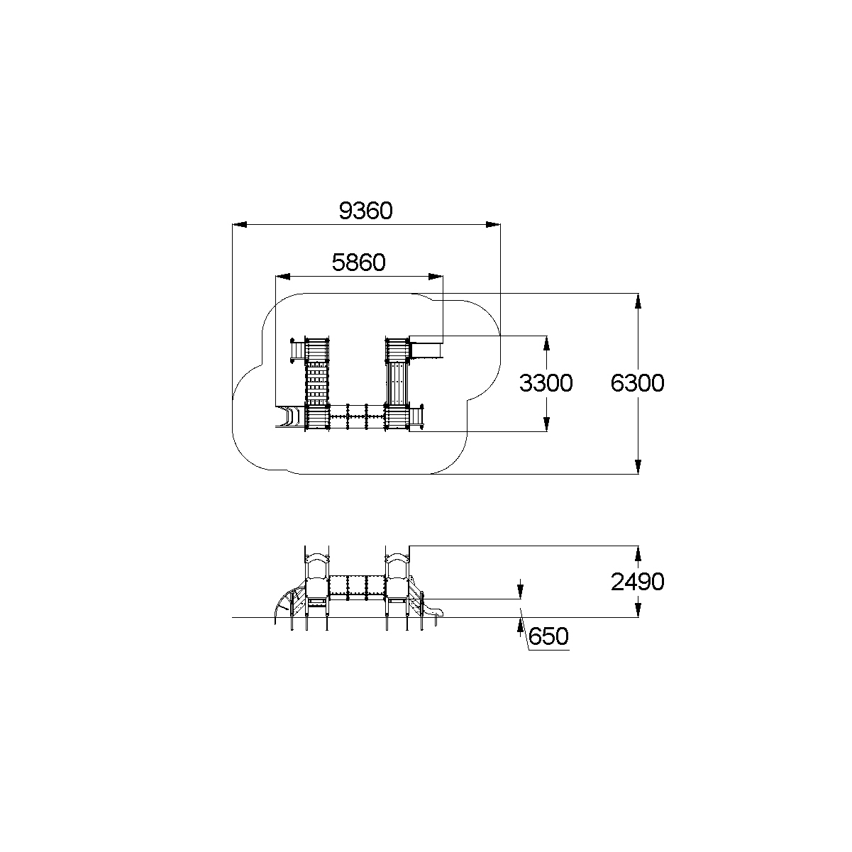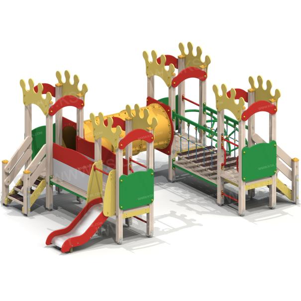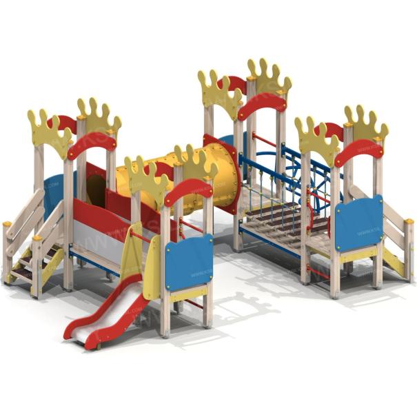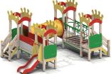 Детский игровой комплекс должен представлять собой модульную сборно-разборную конструкцию, состоящую из 4-х башен с имитацией крыши, стилизованной под корону и соединенных между собой подвесным мостом, пластиковым переходом и прямым мостом. К башне 1 должны быть пристроены: горка, фанерное ограждение, перекладины, поручни. К башне 2 должны быть пристроены: фанерное ограждение, лестница. К башне 3 должны быть пристроены: фанерное ограждение, лиана, перекладина. К башне 4 должны быть пристроены: фанерное ограждение, лестница, перекладины, поручни. Несущие столбы комплекса должны быть выполнены из клееного деревянного бруса сечением не менее 100х100 мм и иметь скругленный профиль с канавкой посередине. Сверху столб должен заканчиваться пластиковой заглушкой, снизу столб должен заканчиваться металлическим оцинкованным подпятником диаметром не менее 42 мм, который бетонируется в землю. Пол башен должен быть выполнен из деревянной доски толщиной не менее 40 мм. Имитация крыши башен должна состоять из 2–х фигурных и 2- х дугообразных накладных элементов, выполненных из влагостойкой фанеры толщиной не менее 21 мм. Горка должна состоять из ската, бортиков, защитной секции и защитной перекладины. Горка должна иметь стартовый участок высотой не менее 650 мм, участок скольжения и конечный участок. Скат должен быть изготовлен из единого листа нержавеющей стали толщиной 1,5 мм, утопленный в паз бортиков горки. Бортики горки, выполненные из влагостойкой фанеры толщиной не менее 21 мм должны быть высотой не менее 100 мм. Защитная перекладина должна быть выполнена из металлической трубы диаметром не менее 33 мм, побуждающая ребенка присесть и установлена на высоте не менее 600 мм от уровня поверхности стартового участка горки. Защитная секция горки должна быть выполнена из влагостойкой фанеры толщиной не менее 21 мм. Лестница высотой не менее 650 мм должна быть оснащена перилами, выполненные из деревянной доски толщиной не менее 40 мм. Перила должны быть установлены от первой ступени. Ступени лестниц должны быть выполнены из ламинированной противоскользящей влагостойкой фанеры толщиной не менее 15 мм и деревянной доски толщиной 40 мм, склеенных между собой. Расстояние между ступенями должно быть одинаковым. Ограждения должны быть выполнены из влагостойкой фанеры толщиной не менее 21 мм. Перекладины, поручни должны быть выполнены из металлической трубы диаметром не менее 33 мм. Лиана должна состоять их 2-х наклонных дуг выполненных из металлической трубы диаметром не менее 42 мм и П-образных ступенек из трубы диаметром не менее 33 мм. Подвесной мост должен состоять из страховочного моста, подвесного моста со ступеньками и перил. Ступеньки должны быть выполнены из влагостойкой ламинированной фанеры толщиной не менее 15 мм и доски толщиной не менее 40 мм склеенных между собой, каждая ступень должна крепиться к полиамидным канатам, диаметром не менее 16 мм. Канат должен крепиться к перилам мостика, выполненных из металлической трубы сечением не менее 60х30 мм. Страховочный мост должен быть выполнен из деревянной доски толщиной не менее 40 мм. Пластиковый переход должен состоять из пластиковых сегментов и двух стенок-входов с круглым отверстием, равным внутреннему диаметру тоннеля. Стенки должны быть выполнены из влагостойкой фанеры толщиной не менее 21 мм. Сегме