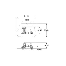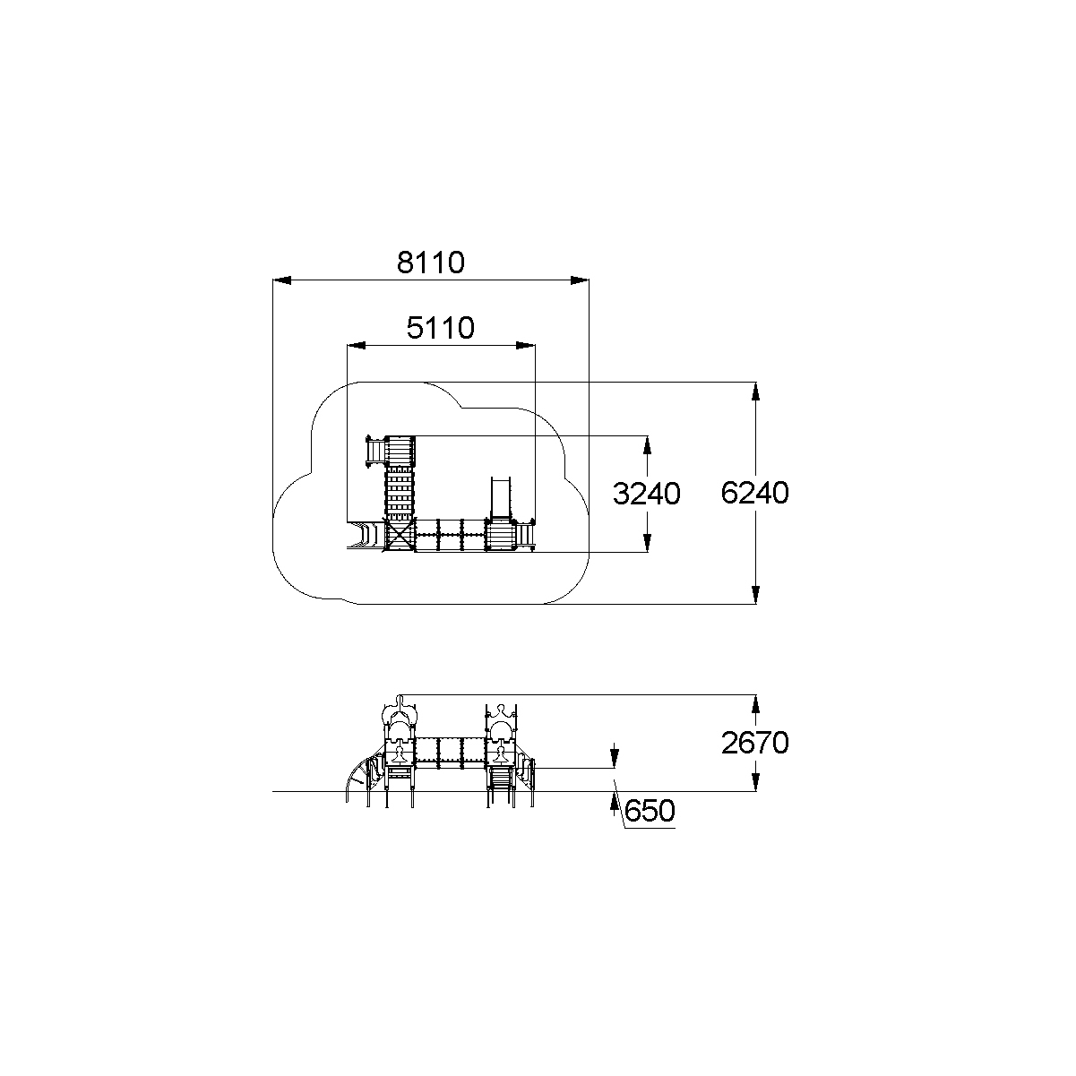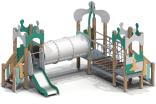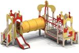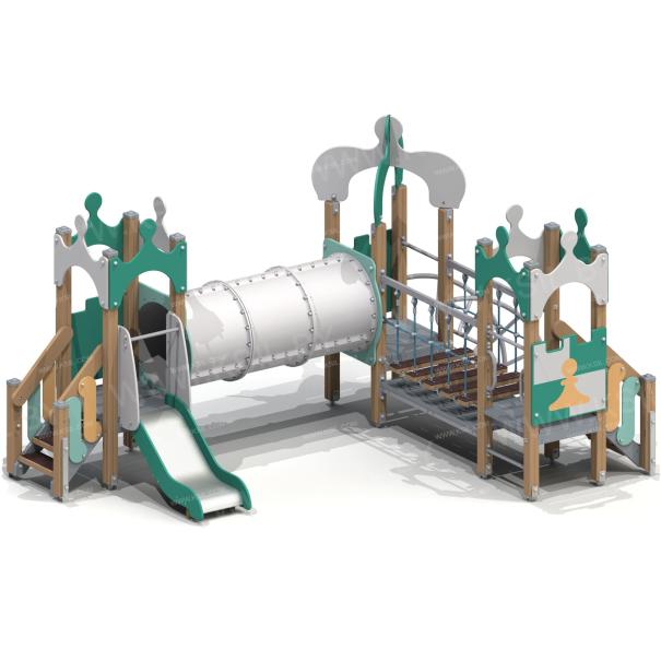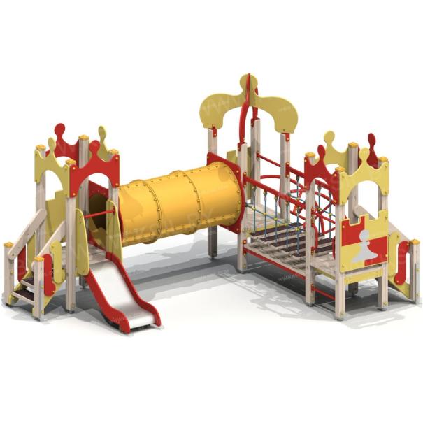 Детский игровой комплекс должен представлять собой модульную сборно-разборную конструкцию, состоящую из трех башен с имитацией крыши в шахматной тематике и соединенных между собой подвесным мостом и тоннельным переходом. К башне 1, с имитацией крыши в виде шахматной фигурки пешки, должны быть пристроены: лестница, горка, фанерное ограждение. К башне 2, с имитацией крыши в виде шахматной фигурки короля, должны быть пристроены: фанерное ограждение, перекладина, лиана. К башне 3, с имитацией крыши в виде шахматной фигурки пешки, должны быть пристроены: лестница, фанерное ограждение, ограждение в виде перекладин, поручни. Несущие столбы комплекса должны быть выполнены из клееного деревянного бруса сечением не менее 100х100 мм и иметь скругленный профиль с канавкой посередине. Сверху столб должен заканчиваться пластиковой заглушкой, снизу столб должен заканчиваться металлическим оцинкованным подпятником диаметром не менее 42 мм, который бетонируется в землю. Пол башен должен быть выполнен из деревянной доски толщиной не менее 40 мм. Имитация крыши башни 1 и башни 3 должна состоять из 4–х фигурных элементов, в виде в виде шахматной фигурки пешки, выполненных из влагостойкой фанеры толщиной не менее 21 мм. Имитация крыши башни 2 должна состоять из 2–х дугообразных фигурных элементов, пересекающих друг друга в виде шахматной фигурки короля и выполненных из влагостойкой фанеры толщиной не менее 21 мм. Горка должна состоять из ската, бортиков, защитной секции и защитной перекладины. Горка должна иметь стартовый участок высотой не менее 650 мм, участок скольжения и конечный участок. Скат должен быть изготовлен из единого листа нержавеющей стали толщиной 1,5 мм, утопленный в паз бортиков горки. Бортики горки, выполненные из влагостойкой фанеры толщиной не менее 21 мм должны быть высотой не менее 100 мм. Защитная перекладина должна быть выполнена из металлической трубы диаметром не менее 33 мм, побуждающая ребенка присесть и установлена на высоте не менее 600 мм от уровня поверхности стартового участка горки. Защитная секция горки должна быть выполнена из влагостойкой фанеры толщиной не менее 21 мм. Лестница высотой не менее 650 мм должна быть оснащена перилами, выполненные из деревянной доски толщиной не менее 40 мм, декоративных накладных элементов из влагостойкой фанеры толщиной 15 мм. Перила должны быть установлены от первой ступени. Ступени лестниц должны быть выполнены из ламинированной противоскользящей влагостойкой фанеры толщиной не менее 15 мм и деревянной доски толщиной 40 мм, склеенных между собой. Расстояние между ступенями должно быть одинаковым. Ограждения с зубчатой верхней гранью должны быть выполнены из влагостойкой фанеры толщиной не менее 21 мм в шахматной тематике. Поручни, ограждения башни в виде перекладин должны быть выполнены из металлической трубы диаметром не менее 33 мм. Подвесной мост должен состоять из страховочного моста, подвесного моста со ступеньками и перил. Ступеньки должны быть выполнены из влагостойкой ламинированной фанеры толщиной не менее 15 мм и доски толщиной не менее 40 мм склеенных между собой, каждая ступень должна крепиться к полиамидным канатам, диаметром не менее 16 мм. Канат должен крепиться к перилам мостика, выполненных из металлической трубы сечением не менее 60х30 мм. Страховочный мост должен быть в