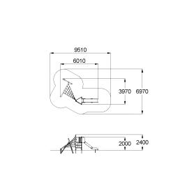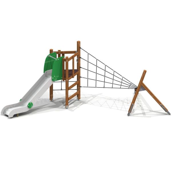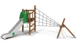 Детский игровой комплекс должен состоять из башни треугольной формы и наклонного бума. К башне, с высотой площадки не менее 1250 мм, должны быть пристроены: горка Н=1,25 м, объёмная сетка из полипропиленового каната, сетка под площадкой из полипропиленового каната, поручень малый, вертикальная лазалка из деревянных направляющих, ограждение в виде заборчика. Башня соединена с наклонным бумом объемной сеткой в виде лучей из полипропиленового 6-типрядного каната, армированного металлом, соединенных пластиковыми элементами. Несущие столбы комплекса должны быть выполнены из клееного деревянного бруса лиственницы сечением не менее 100х100 мм и иметь скругленный профиль. Снизу столб крепится на металлический оцинкованный подпятник диаметром трубы не менее 42 мм, который бетонируется в землю.Наклонный бум и его опоры должны быть выполнены из клееного деревянного бруса лиственницы сечением не менее 100х100 мм и иметь скругленный профиль. Снизу наклонный бум и его опоры крепятся на металлические подпятники из профильной трубы сечением 50х25 с толщиной стенки не менее 2.5 мм, которые бетонируются в землю. Соединение наклонного бума с опорами выполнено в виде кронштейна из металлического листа толщиной не менее 4 мм и окрашенного порошковыми красками. Пол башни должен быть изготовлен из водостойкой ламинированной нескользящей фанеры толщиной не менее 21 мм. Горка должна состоять из каркаса, ската, бортиков, защитной секции и защитной перекладины. Каркас горки должен быть выполнен из металлической трубы сечением не менее 50х25 мм. Горка должна иметь стартовый участок высотой не менее 1250 мм, участок скольжения и конечный участок. Скат должен быть изготовлен из единого листа нержавеющей стали толщиной 1,5 мм, утопленный в паз бортиков горки. Бортики горки должны быть высотой не менее 150 мм. Защитная перекладина должна быть выполнена из металлической трубы диаметром не менее 33 мм, побуждающая ребенка присесть и установлена на высоте не менее 700 мм от поверхности стартового участка горки. Защитная секция горки должна быть выполнена из водостойкой фанеры толщиной не менее 21 мм. Поручень должен быть выполнен из металлической трубы диаметром не менее 21 мм. Сетки и соединительные лучи должны быть выполнены из полипропиленового 6-типрядного каната армированного металлом каната тросовой свивки с резиновым сердечником, канат сетки должен быть диаметром не менее 16 мм и соединен между собой пластиковыми креплениями. Сетка должна крепиться к наклонному буму и к несущим столбам комплекса.Ограждение в виде заборчика и вертикальная лазалка состоят из горизонтальных направляющих, выполненных из досок лиственницы сечением 100х40 мм и вертикальных досок из лиственницы сечением 100х30 мм. Все кромки должны быть скруглены радиусом не менее 3 мм.
