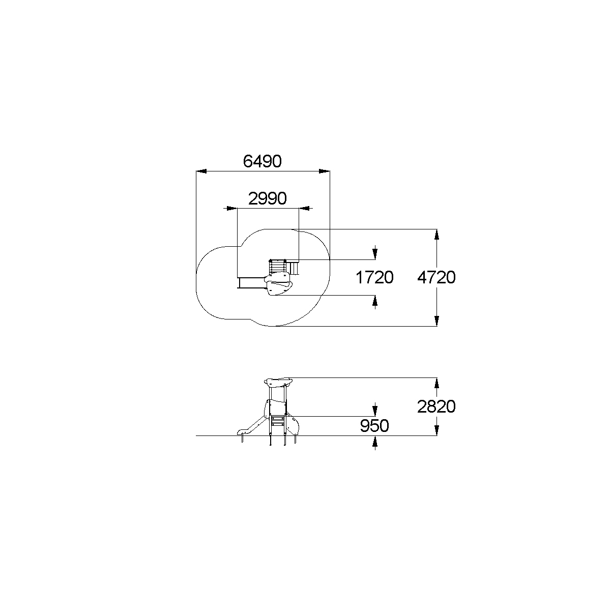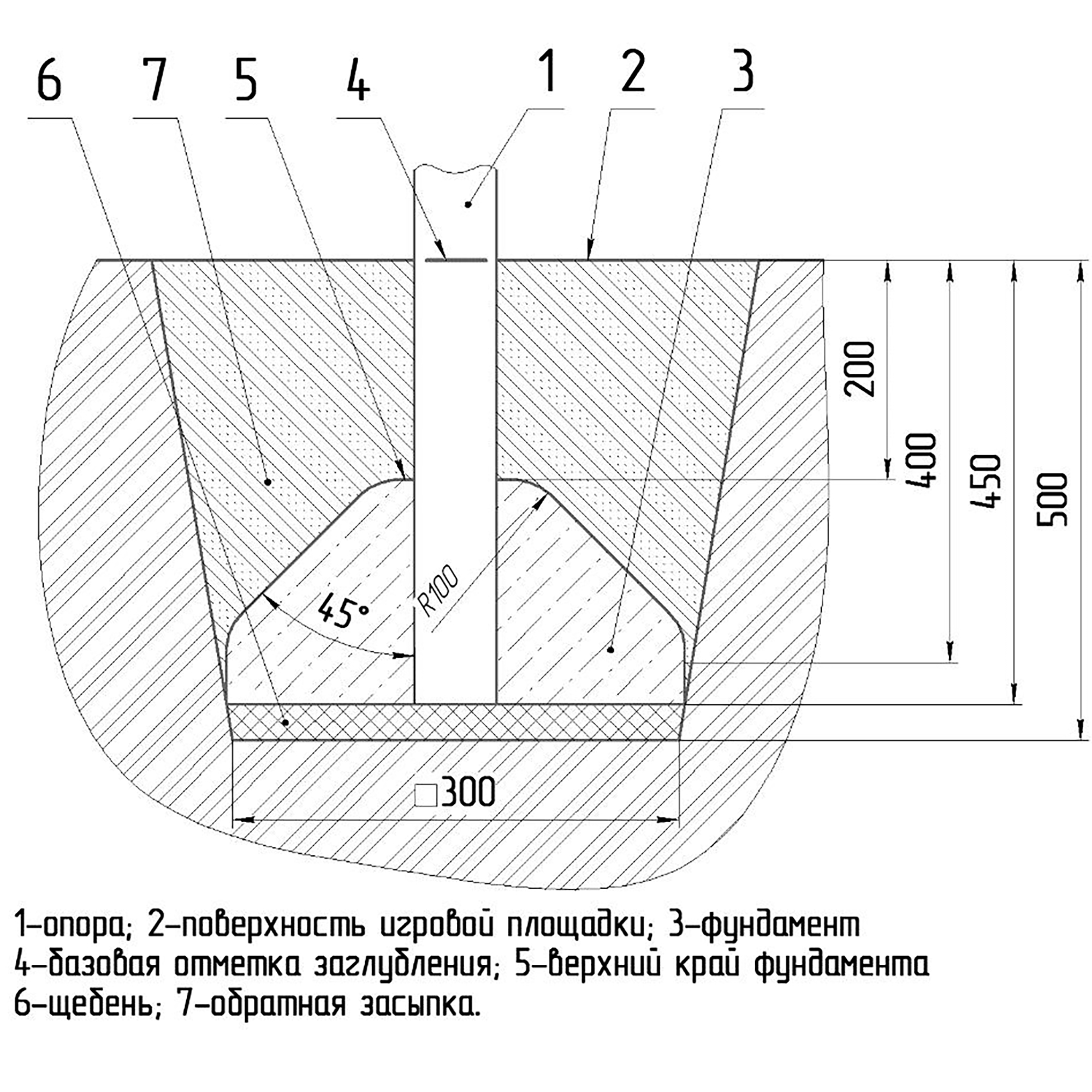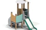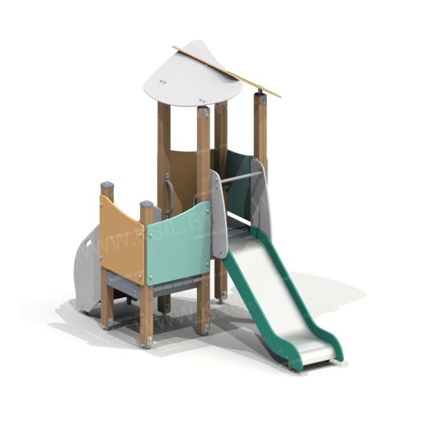 Детский игровой комплекс должен представлять собой модульную сборно-разборную конструкцию, состоящую из башни и полубашни. К башне с крышей, с высотой площадки не менее 950 мм, должны быть пристроены: горка, фанерные ограждения, поручни. К полубашне должны быть пристроены: лестница, фанерные ограждения. Несущие столбы комплекса должны быть выполнены из клееного деревянного бруса сечением не менее 100х100 мм и иметь скругленный профиль с канавкой посередине. Сверху открытый столб должен заканчиваться пластиковой заглушкой, снизу столб должен заканчиваться металлическим оцинкованным подпятником диаметром не менее 42 мм, который бетонируется в землю. Пол башни и полубашни должен быть выполнен из ламинированной противоскользящей водостойкой фанеры толщиной не менее 21 мм. Крыша башни должна быть выполнена из 2-х скатов пересекающих друг друга и выполненных из водостойкой фанеры толщиной не менее 15 мм. Ограждения башен должны быть выполнены из водостойкой фанеры толщиной не менее 21 мм. Поручни должны быть выполнены из металлической трубы диаметром не менее 33 мм. Горка должна состоять из ската, бортиков, защитной секции и защитной перекладины. Горка должна иметь стартовый участок высотой не менее 950 мм, участок скольжения и конечный участок. Скат должен быть изготовлен из единого листа нержавеющей стали толщиной 1,5 мм, утопленный в паз бортиков горки. Бортики горки, выполненные из водостойкой фанеры толщиной не менее 21 мм должны быть высотой не менее 100 мм. Защитная перекладина должна быть выполнена из металлической трубы диаметром не менее 33 мм, побуждающая ребенка присесть и установлена на высоте не менее 600 мм от уровня поверхности стартового участка горки. Защитная секция горки должна быть выполнена из водостойкой фанеры толщиной не менее 21 мм. Лестница высотой не менее 650 мм должна быть оснащена бортами с отверстиями для рук, выполненные из водостойкой фанеры толщиной не менее 21 мм. Борта должны быть установлены от первой ступени. Ступени лестниц должны быть выполнены из ламинированной противоскользящей водостойкой фанеры толщиной не менее 21 мм. Расстояние между ступенями должно быть одинаковым.