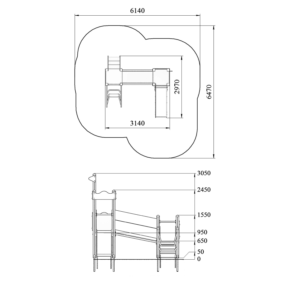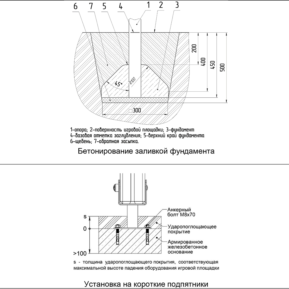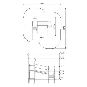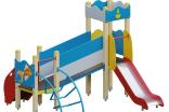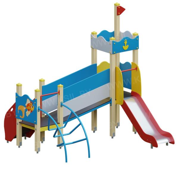Детский игровой комплекс должен представлять собой модульную сборно-разборную конструкцию, стилизованную под сказу «Золотая рыбка». Детский комплекс должен состоять из 2-х башен, соединенных между собой наклонным мостом. К башне 1, с имитацией крыши, с высотой площадки не менее 950 мм, должны быть пристроены: горка, фанерные ограждения. К башне 2, с высотой площадки не менее 650 мм, должны быть пристроены: фанерное ограждение с художественной росписью золотой рыбки, лестница, перекладина, лиана. Несущие столбы комплекса должны быть выполнены из клееного деревянного бруса сечением не менее 100х100 мм и иметь скругленный профиль с канавкой посередине. Сверху столб должен заканчиваться пластиковой заглушкой, снизу столб должен заканчиваться металлическим оцинкованным подпятником диаметром не менее 42 мм, который бетонируется в землю. Пол башен должен быть выполнен из деревянной доски толщиной не менее 40 мм. Имитация крыши должна состоять из 4-х накладных элементов с волнообразной верхней гранью и с декоративным элементом в виде якоря, выполненных из влагостойкой фанеры толщиной не менее 21 мм и не менее 9 мм. Горка должна состоять из ската, бортиков, защитной секции и защитной перекладины. Горка должна иметь стартовый участок высотой не менее 950 мм, участок скольжения и конечный участок. Скат должен быть изготовлен из единого листа нержавеющей стали толщиной 1,5 мм, утопленный в паз бортиков горки. Бортики горки должны быть высотой не менее 100 мм. Защитная перекладина должна быть выполнена из металлической трубы диаметром не менее 33 мм, побуждающая ребенка присесть и установлена на высоте не менее 600 мм от уровня поверхности стартового участка горки. Защитная секция горки должна быть выполнена из влагостойкой фанеры толщиной не менее 21 мм. Лестница высотой не менее 650 мм должна быть оснащена перилами, выполненные из деревянной доски толщиной не менее 40 мм. Перила должны быть установлены от первой ступени. Ступени лестниц должны быть выполнены из ламинированной противоскользящей влагостойкой фанеры толщиной не менее 15 мм и деревянной доски толщиной 40 мм, склеенных между собой. Расстояние между ступенями должно быть одинаковым. Ограждения башен должны быть выполнены из влагостойкой фанеры толщиной не менее 21 мм. Перекладины должны быть выполнены из металлической трубы диаметром не менее 33 мм. Лиана должна состоять их 2-х наклонных дуг выполненных из металлической трубы диаметром не менее 42 мм и П-образных ступенек из трубы диаметром не менее 33 мм. Наклонный мост должен состоять металлического каркаса, настила и ограждения. Настил должен быть выполнен из ламинированной влагостойкой фанеры толщиной не менее 21 мм. Ограждение моста должны быть выполнены из влагостойкой фанеры толщиной не менее 21 мм. Металлический каркас моста должен быть разборным и состоять из металлической профильной трубы сечением не менее 50х25 мм. Габаритные размеры: 3140х2970х3050 мм. Высота площадок от уровня земли (мм): 650 и 950.