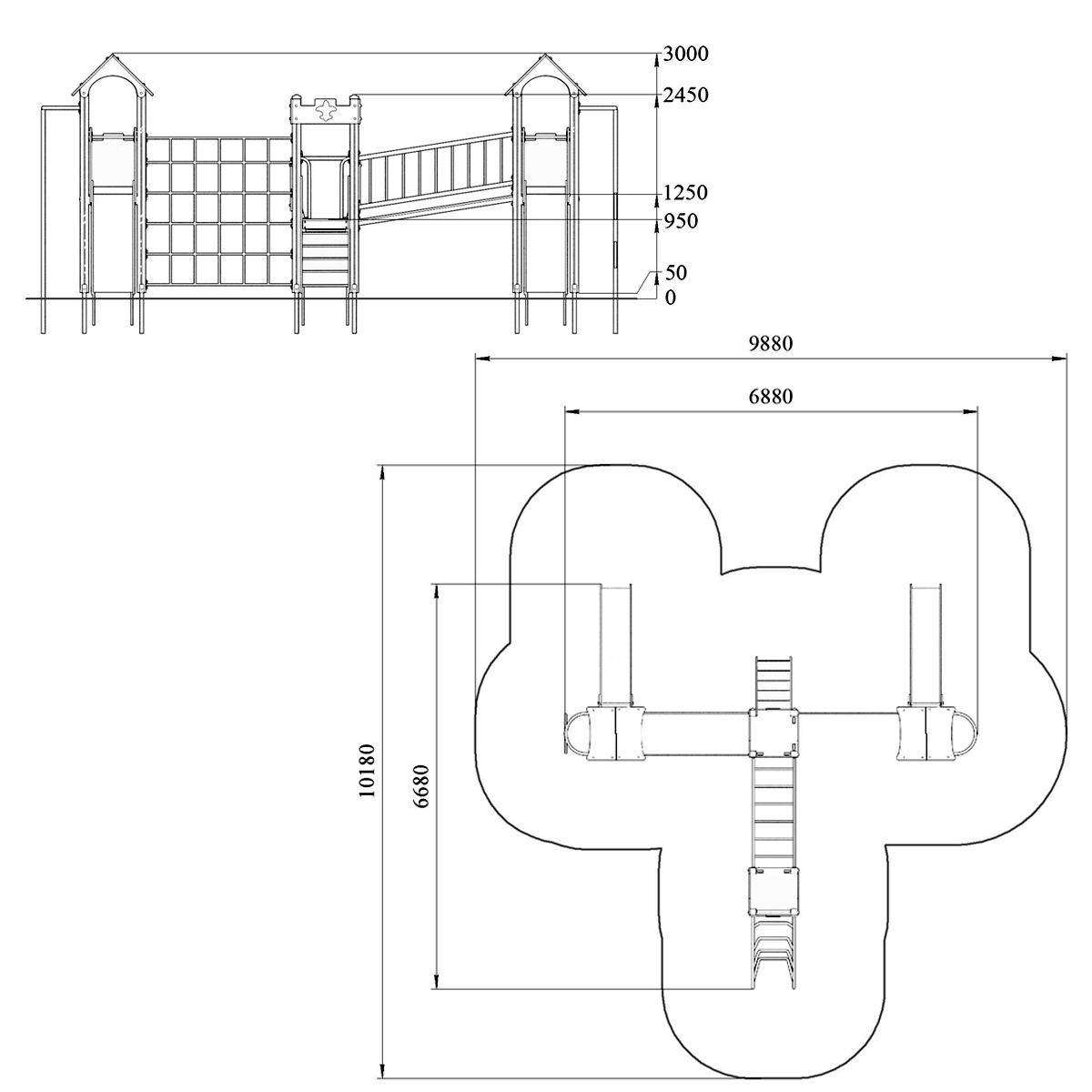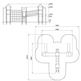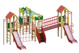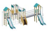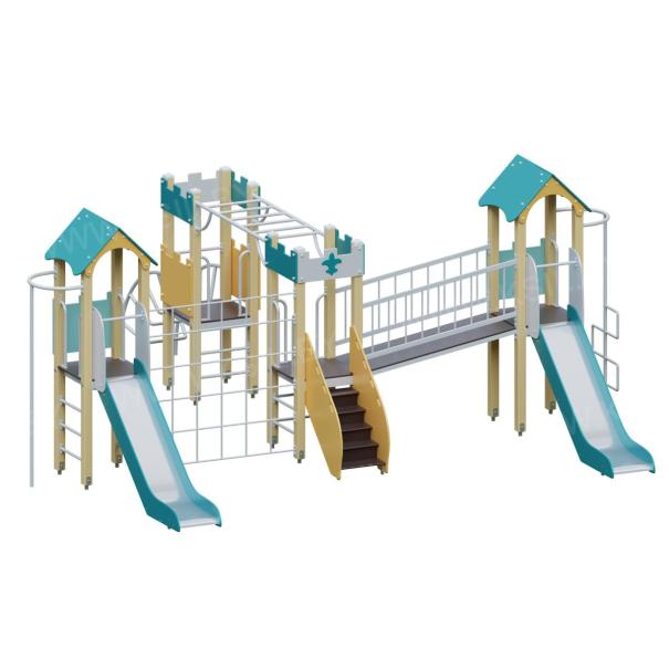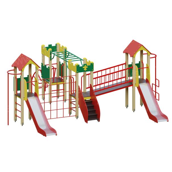 Детский игровой комплекс должен представлять собой модульную сборно-разборную конструкцию, состоящую из 4-х башен, соединенных между собой наклонным мостом, рукоходом, сеткой – решеткой металлической. 2 башни оснащены крышей, которая состоит из 2-х скатов, выполненных из водостойкой фанеры толщиной не менее 21 мм, 2-х фронтонов, выполненных из влагостойкой фанеры толщиной не менее 21 мм. 2 башни оснащены имитацией крыши, которая состоит из зубчатых накладных элементов по периметру башни из влагостойкой фанеры толщиной не менее 21 мм. Несущие столбы комплекса должны быть выполнены из клееного деревянного бруса сечением не менее 100х100 мм и иметь скругленный профиль. Снизу столб должен заканчиваться металлическим оцинкованным подпятником диаметром не менее 42 мм, который бетонируется в землю. Пол башен и наклонный мост должен быть выполнен из водостойкой противоскользящей фанеры толщиной не менее 21 мм. Ограждения прямого моста должны состоять из металлических балок – горизонтальная балка из профильной трубы сечением не менее 50х25, вертикальная - из трубы диаметром не менее 21 мм. Горка должна иметь стартовый участок высотой не менее 1200 мм, участок скольжения и конечный участок. Скат должен быть изготовлен из единого листа нержавеющей стали толщиной 1,5 мм, утопленный в паз бортиков горки. Бортики горки, выполненные из влагостойкой фанеры толщиной не менее 21 мм должны быть высотой не менее 100 мм. Защитная перекладина должна быть выполнена из металлической трубы диаметром не менее 33 мм, побуждающая ребенка присесть и установлена на высоте не менее 600 мм от уровня поверхности стартового участка горки. Защитная секция горки должна быть выполнена из влагостойкой фанеры толщиной не менее 21 мм. Лестница высотой не менее 900 мм должны быть оснащены перилами, выполненными из влагостойкой фанеры толщиной не менее 21 мм. Перила должны быть установлены от первой ступени. Ступени лестниц должны быть выполнены из ламинированной противоскользящей влагостойкой фанеры толщиной не менее 21 мм. Расстояние между ступенями должно быть одинаковым. Вертикальный шест и шест Зиг-заг должен быть выполнен из металлической трубы диаметром не менее 33 мм. Нижняя часть шеста бетонируется в землю. Сетка – решетка должна быть выполнена из металлической трубы диаметром не менее 33 мм. Рукоход должен быть выполнен из металлической трубы диаметром не менее 33 мм. Наклонная лиана должна состоять их 2-х наклонных дуг выполненных из металлической трубы диаметром не менее 42 мм и П-образных ступенек из трубы диаметром не менее 33 мм. Перекладины вертикальной лестницы, ограждение в виде перекладин, перекладины шведской стенки, поручни, раскосы должны быть выполнены из металлической трубы диаметром не менее 33 мм.
