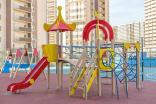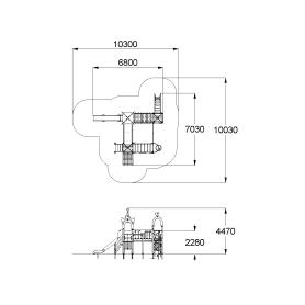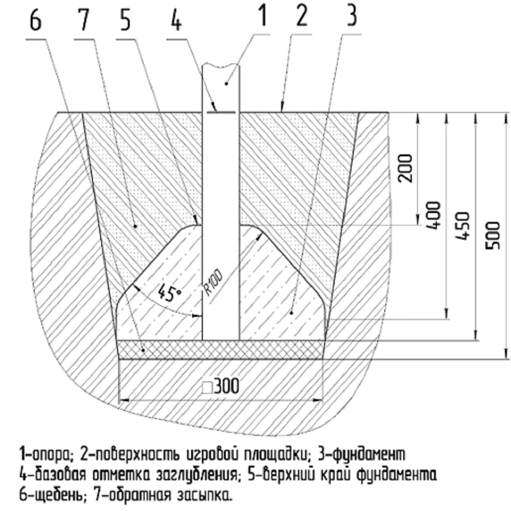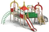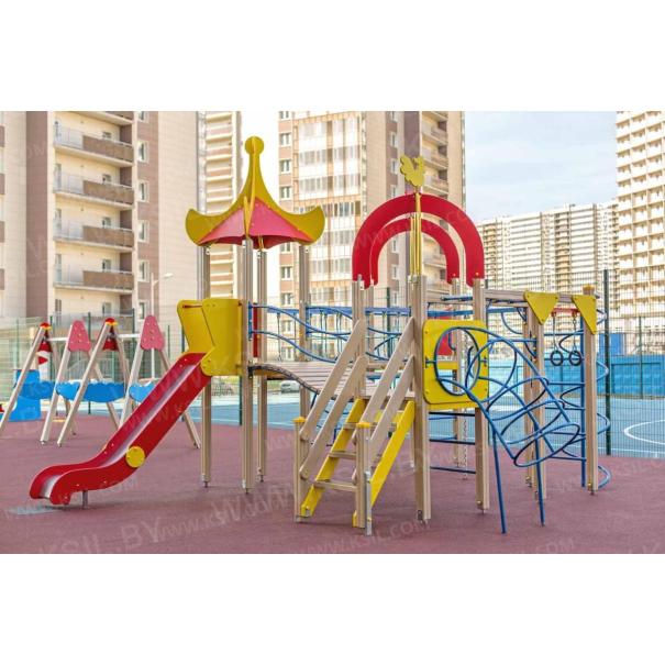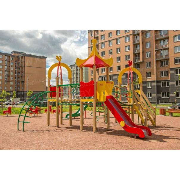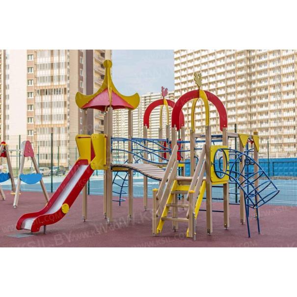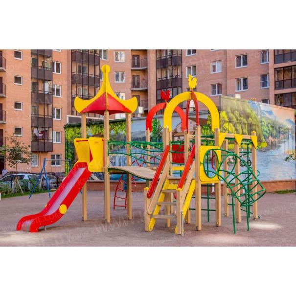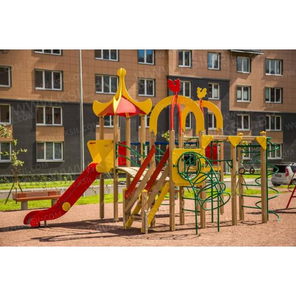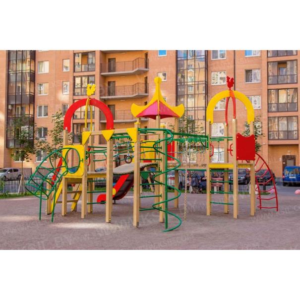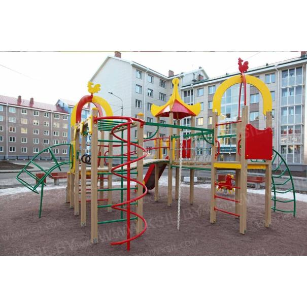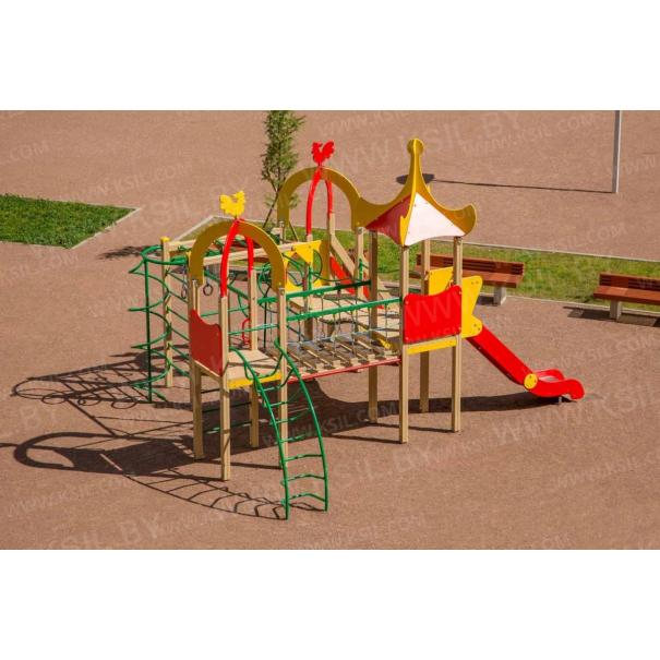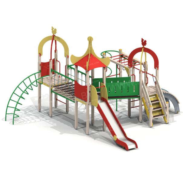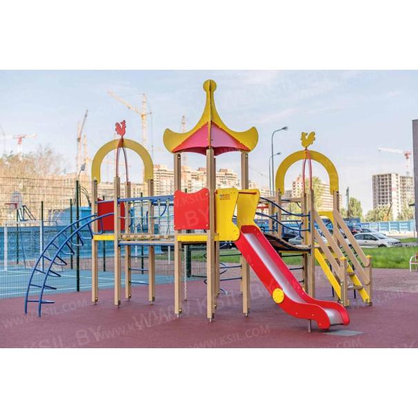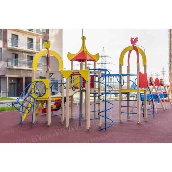 Детский игровой комплекс должен представлять собой модульную сборно-разборную конструкцию и состоять из 3-х башен, соединенных между собой наклонным и подвесным мостами и вынесенным гимнастическим комплексом. К башне 1 с имитацией крыши, с высотой площадки не менее 1250 мм, должны быть пристроены: фанерный трап-барабан, перекладина с веревкой, вертикальная лестница, поручни, г-образные поручни, лестница. К башне 2 с крышей, с высотой площадки не менее 1550 мм, должны быть пристроены: горка, фанерное ограждение. К башне 3 с имитацией крыши, с высотой площадки не менее 1550 мм, должны быть пристроены: наклонная лиана, перекладины, поручни, фанерное ограждение, вертикальная лестница. Башня 1 и башня 3 имеют продолжение в виде гимнастического комплекса. Гимнастический комплекс должен состоять из рукохода, шведской стенки, вертикального шеста со спиралью и креплением в виде дуги, перекладины с канатом. Перекладина с канатом должна крепиться к несущим столбам башни 3 и рукохода. Проемы гимнастического комплекса должны быть оснащены: гимнастическими кольцами, вертикальным шестом, усиленной перекладиной. Несущие столбы комплекса должны быть выполнены из клееного деревянного бруса сечением не менее 100х100 мм и иметь скругленный профиль с канавкой посередине. Снизу столб должен заканчиваться металлическим оцинкованным подпятником диаметром не менее 42 мм, который бетонируется в землю. Пол башен должен быть выполнен из ламинированной противоскользящей водостойкой фанеры толщиной не менее 21 мм. Крыша башни должна состоять из 4-х скатов, выполненных из водостойкой фанеры толщиной не менее 9 мм и 4-х стропил из водостойкой фанеры толщиной не менее 15 мм. Имитация крыши должна состоять из двух декоративных арок толщиной не менее 21 мм, пересекающих друг друга. Сверху должен быть установлен декоративный петушок на кронштейне. Лестница высотой не менее 1250 мм должна быть оснащена перилами, выполненными из водостойкой фанеры толщиной не менее 21 мм. Перила должны быть установлены от первой ступени. Ступени лестниц должны быть выполнены из ламинированной противоскользящей водостойкой фанеры толщиной не менее 21 мм. Расстояние между ступенями должно быть одинаковым. Фанерный трап- барабан должен состоять из направляющих опор, состоящих из сдвоенных фанерных частей, толщина фанеры не менее 21 мм, и наборных частей, равномерно распределенных по опорам и выполненных из деревянной доски толщиной 40 мм. Снизу трап-барабан опирается на окрашенный подпятник ил металлической трубы диаметром не менее 33,5 мм, который бетонируется в землю. Горка должна состоять из каркаса, ската, бортиков, защитной секции и защитной перекладины. Каркас горки должен быть выполнен из металлической трубы сечением не менее 50х25 мм. Горка должна иметь стартовый участок высотой не менее 1550 мм, участок скольжения и конечный участок. Скат должен быть изготовлен из единого листа нержавеющей стали толщиной 1,5 мм, утопленный в паз бортиков горки. Бортики горки, выполненные из водостойкой фанеры толщиной не менее 21 мм должны быть высотой не менее 150 мм. Защитная перекладина должна быть выполнена из металлической трубы диаметром не менее 33 мм, побуждающая ребенка присесть и установлена на высоте не менее 600 мм от уровня поверхности стартового участка горки. Защитная секция горки должна быть вы